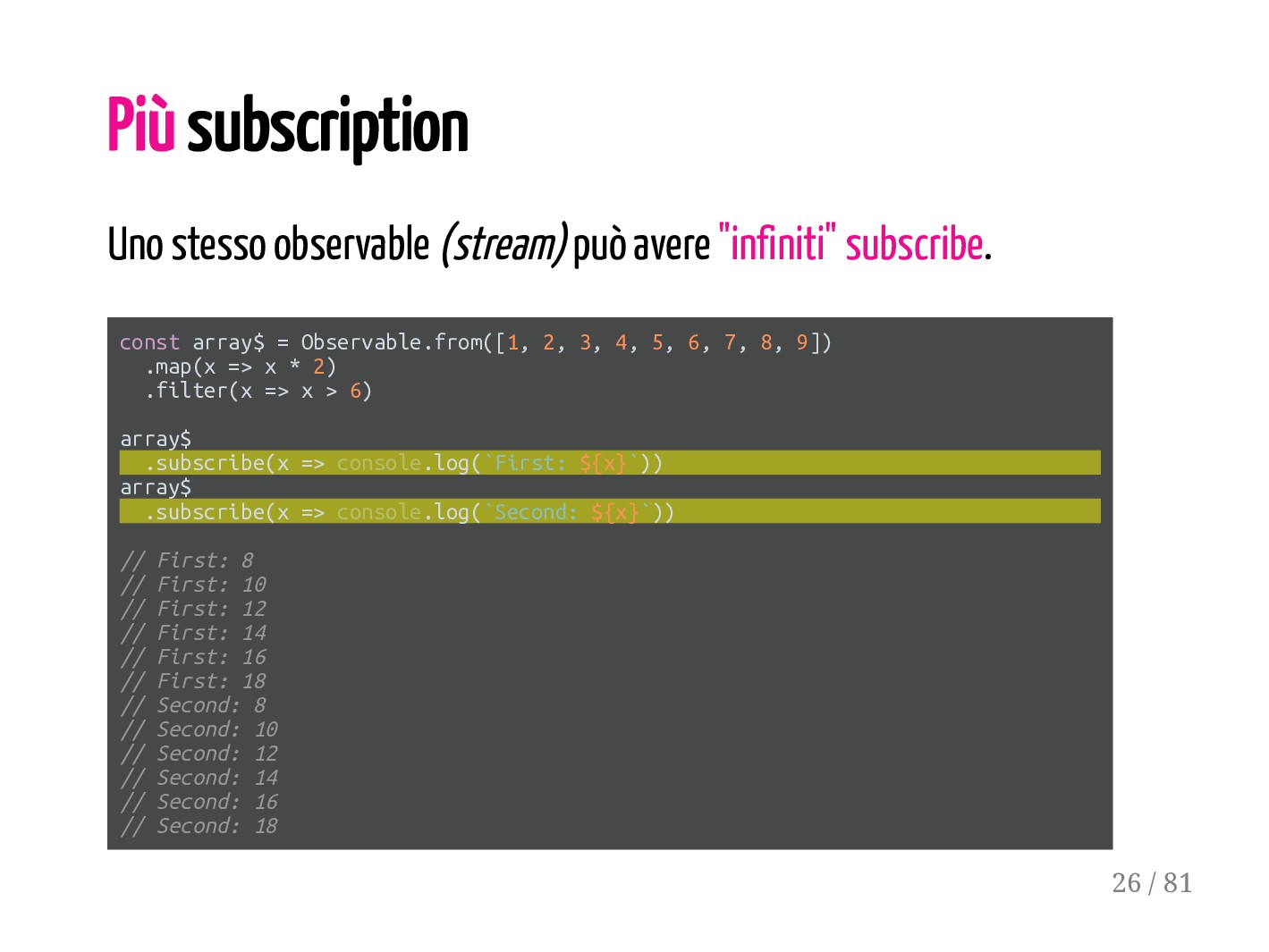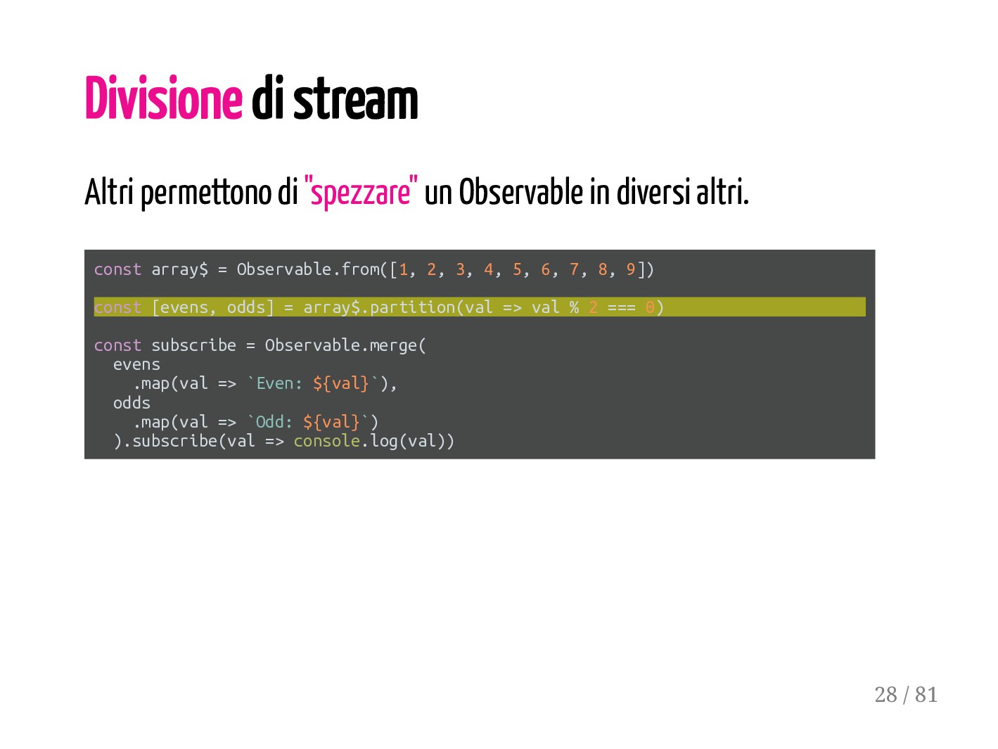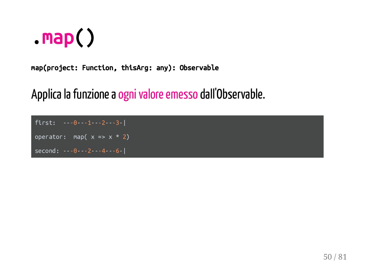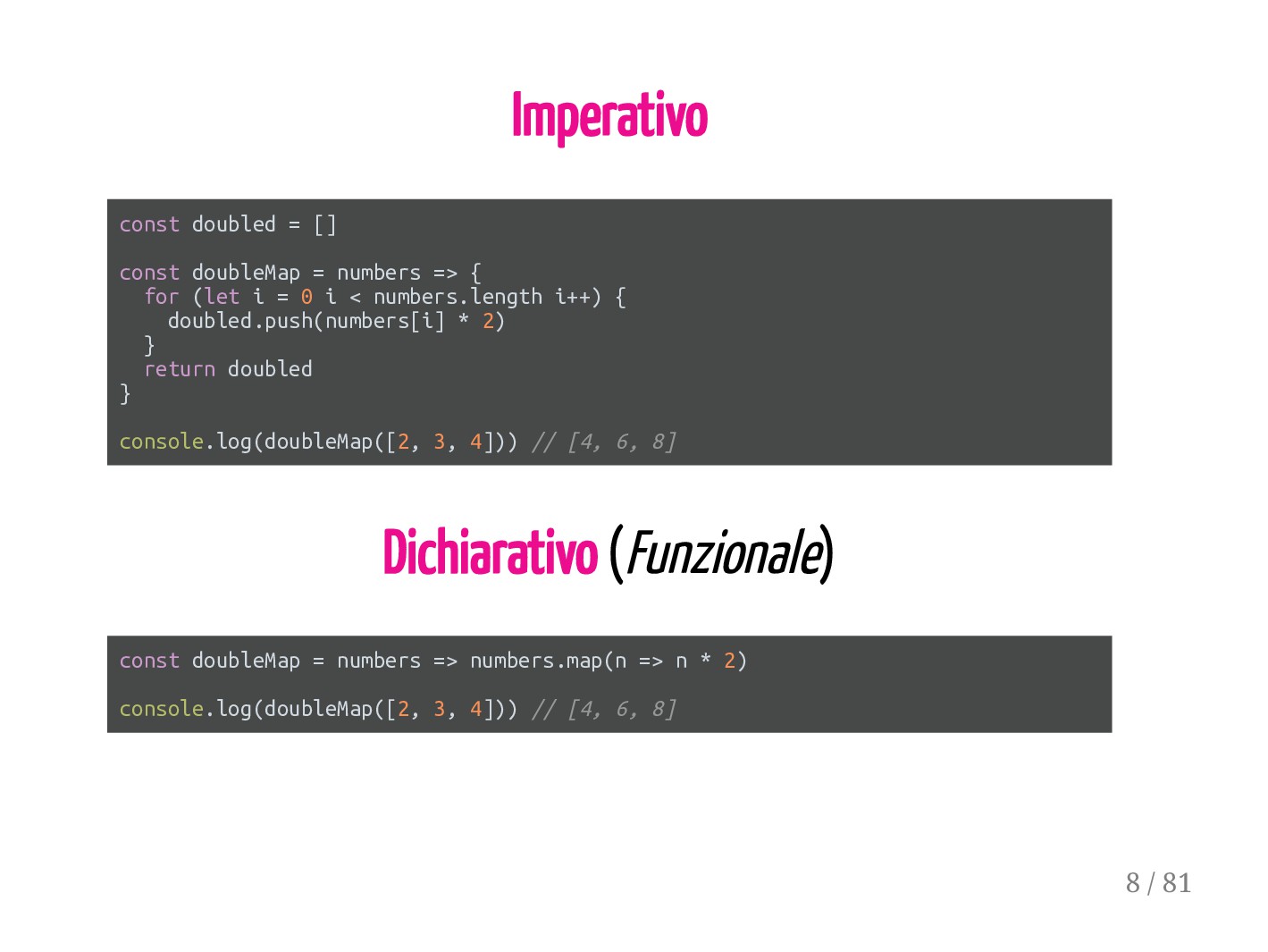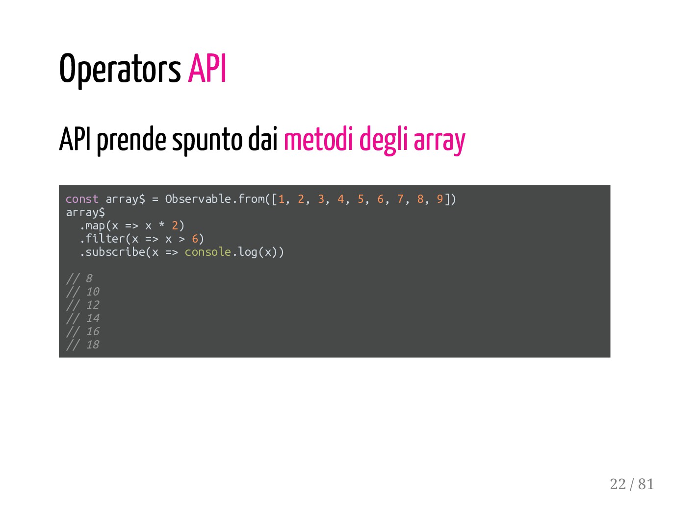 const source = ['1', '1', 'foo', '2', '3', '5', 'bar', '8', '13'] const result = source .map(x => parseInt(x)) // applica la funzione parseInt a ogni elemento //.filter(x => !isNaN(x)) //.reduce((x, y) => x + y) console.log(result) // logs: [1, 1, NaN, 2, 3, 5, NaN, 8, 13] 10 / 81