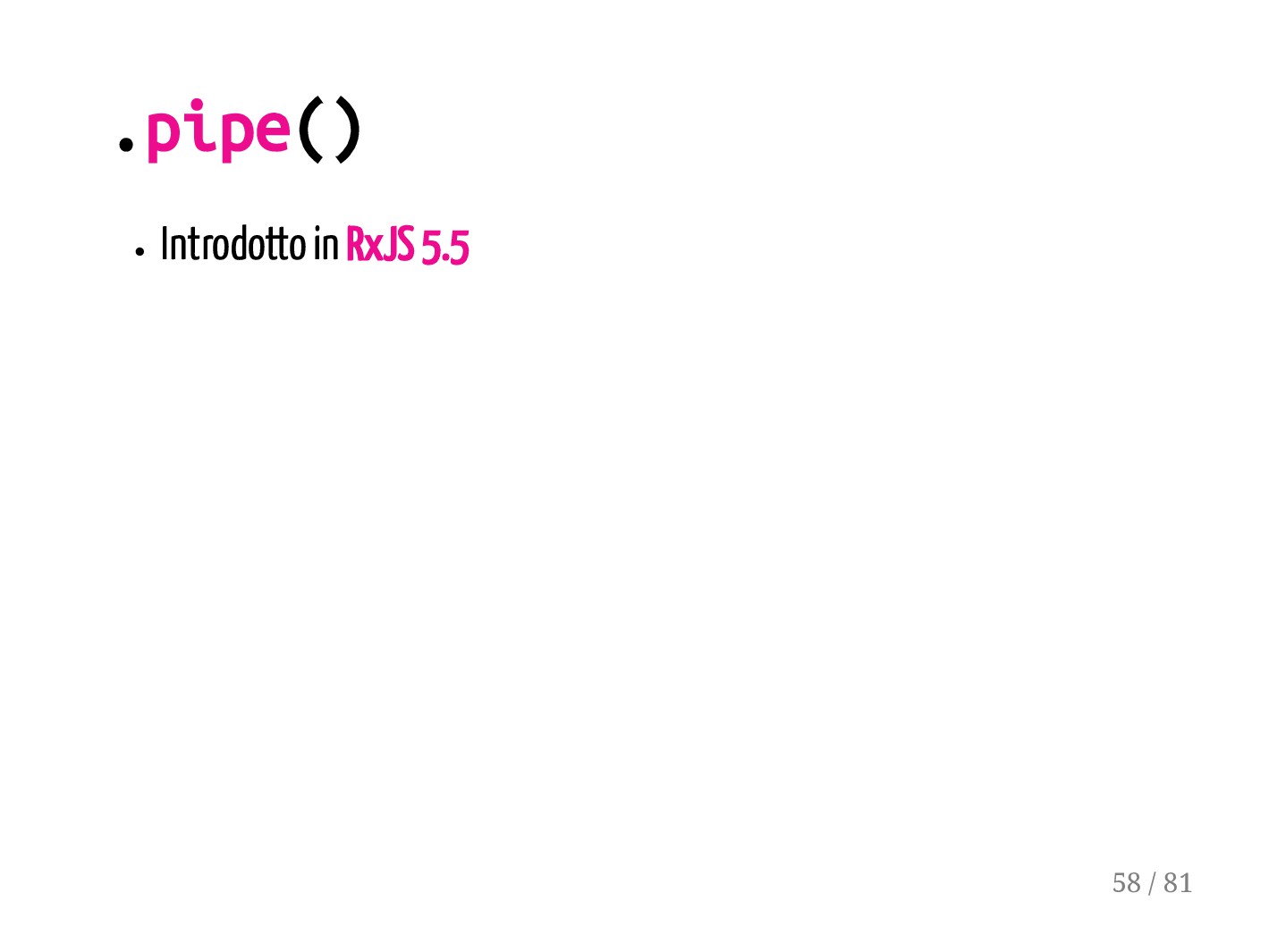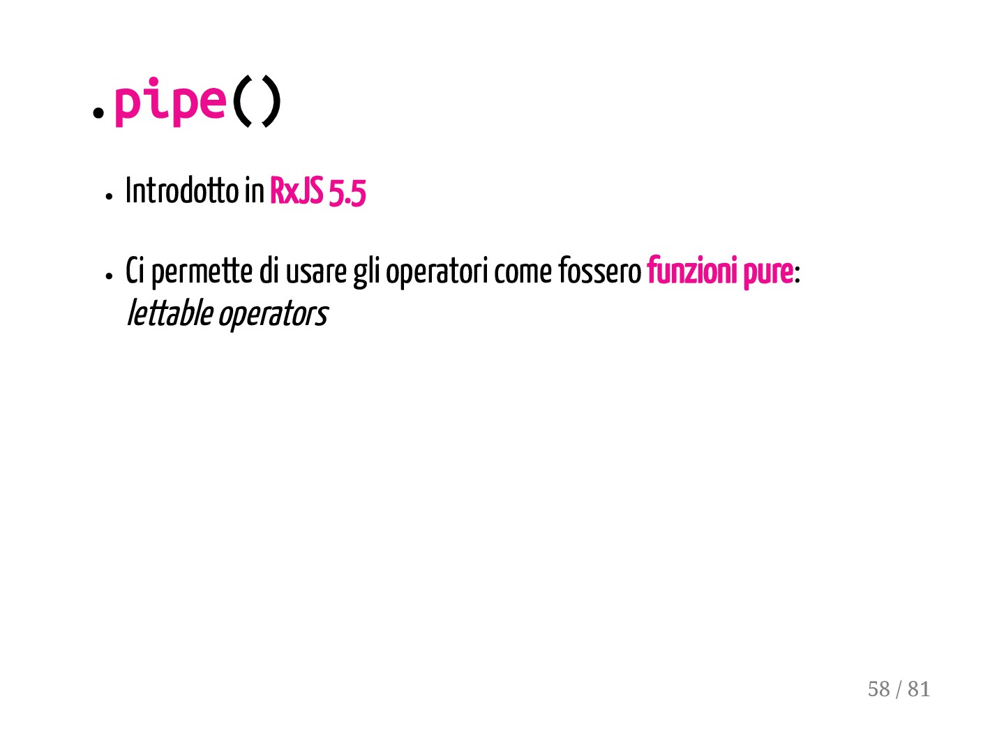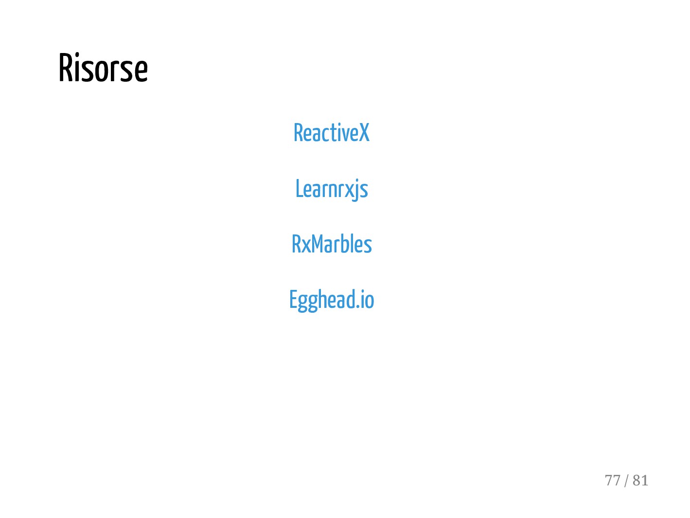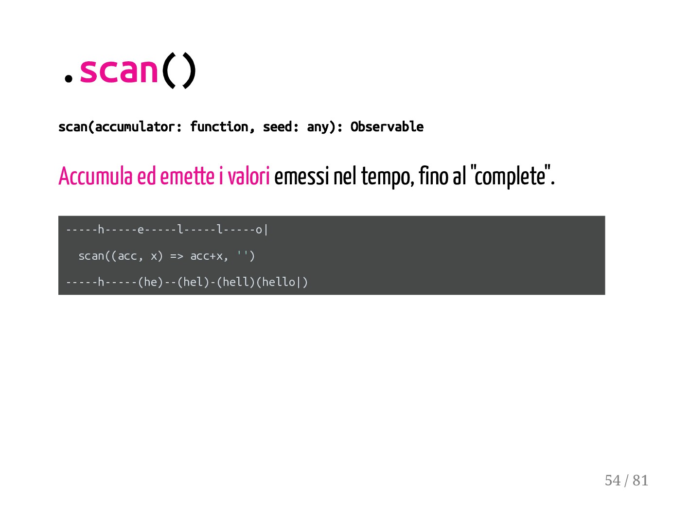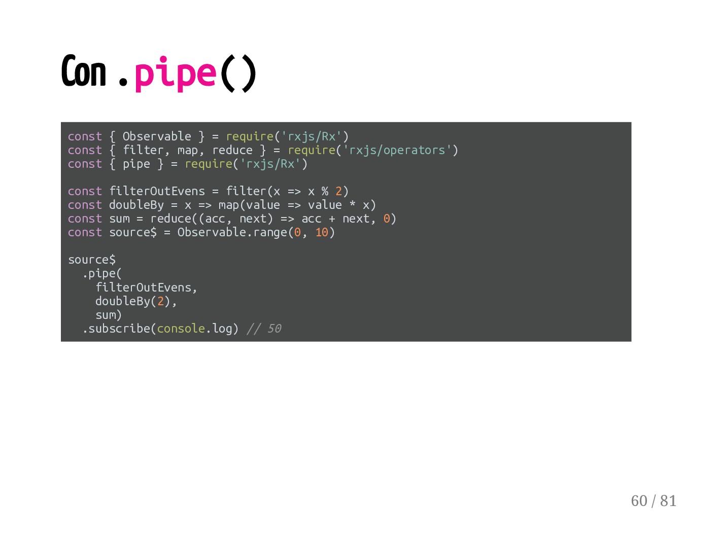const source = ['1', '1', 'foo', '2', '3', '5', 'bar', '8', '13'] const result = source .map(x => parseInt(x)) // applica la funzione parseInt a ogni elemento //.filter(x => !isNaN(x)) //.reduce((x, y) => x + y) console.log(result) // logs: [1, 1, NaN, 2, 3, 5, NaN, 8, 13] 10 / 81