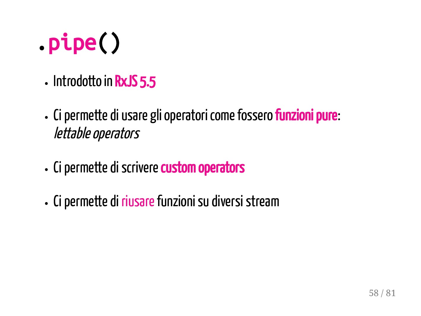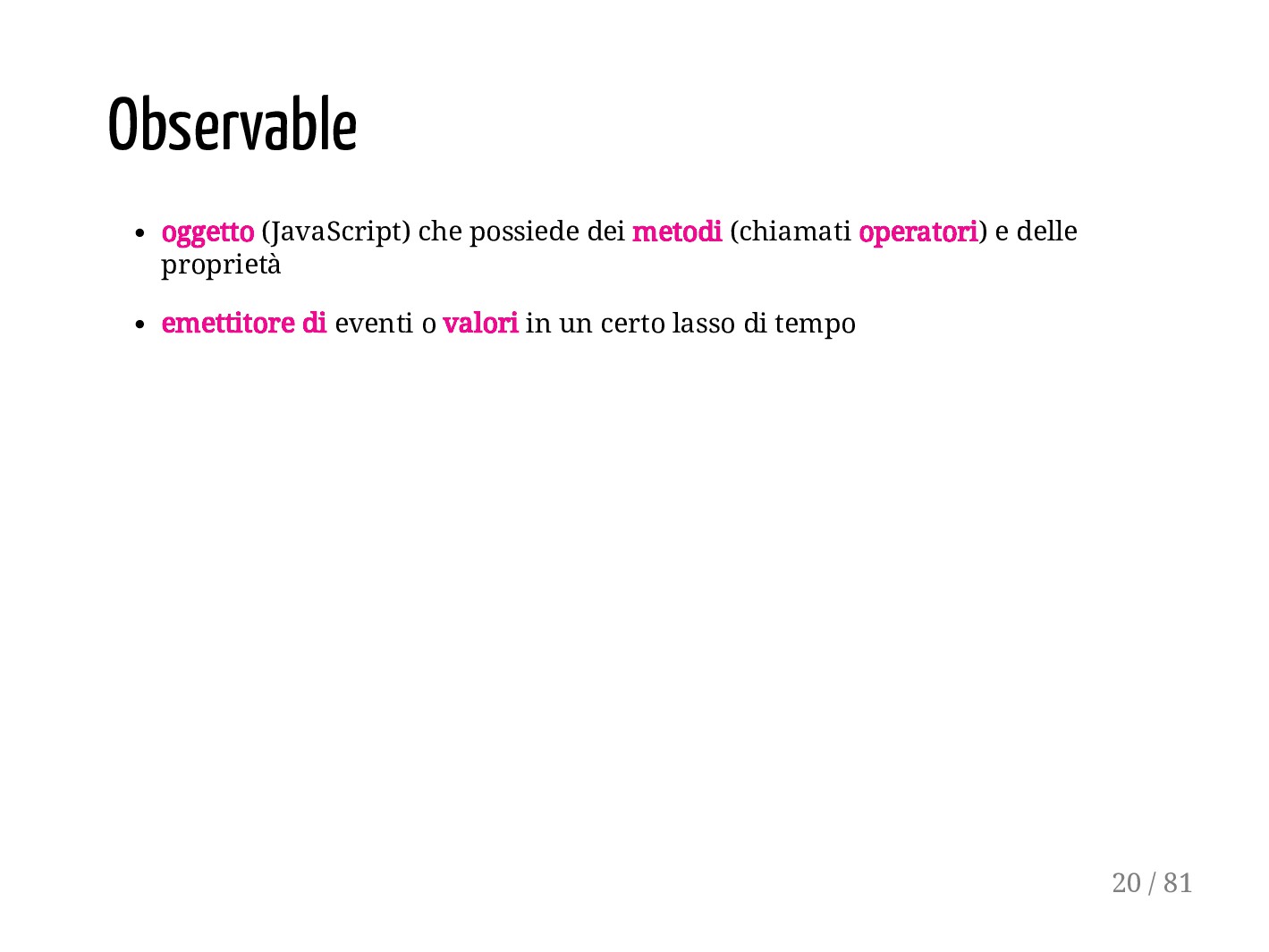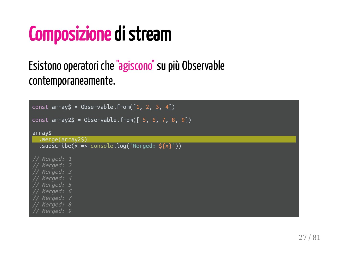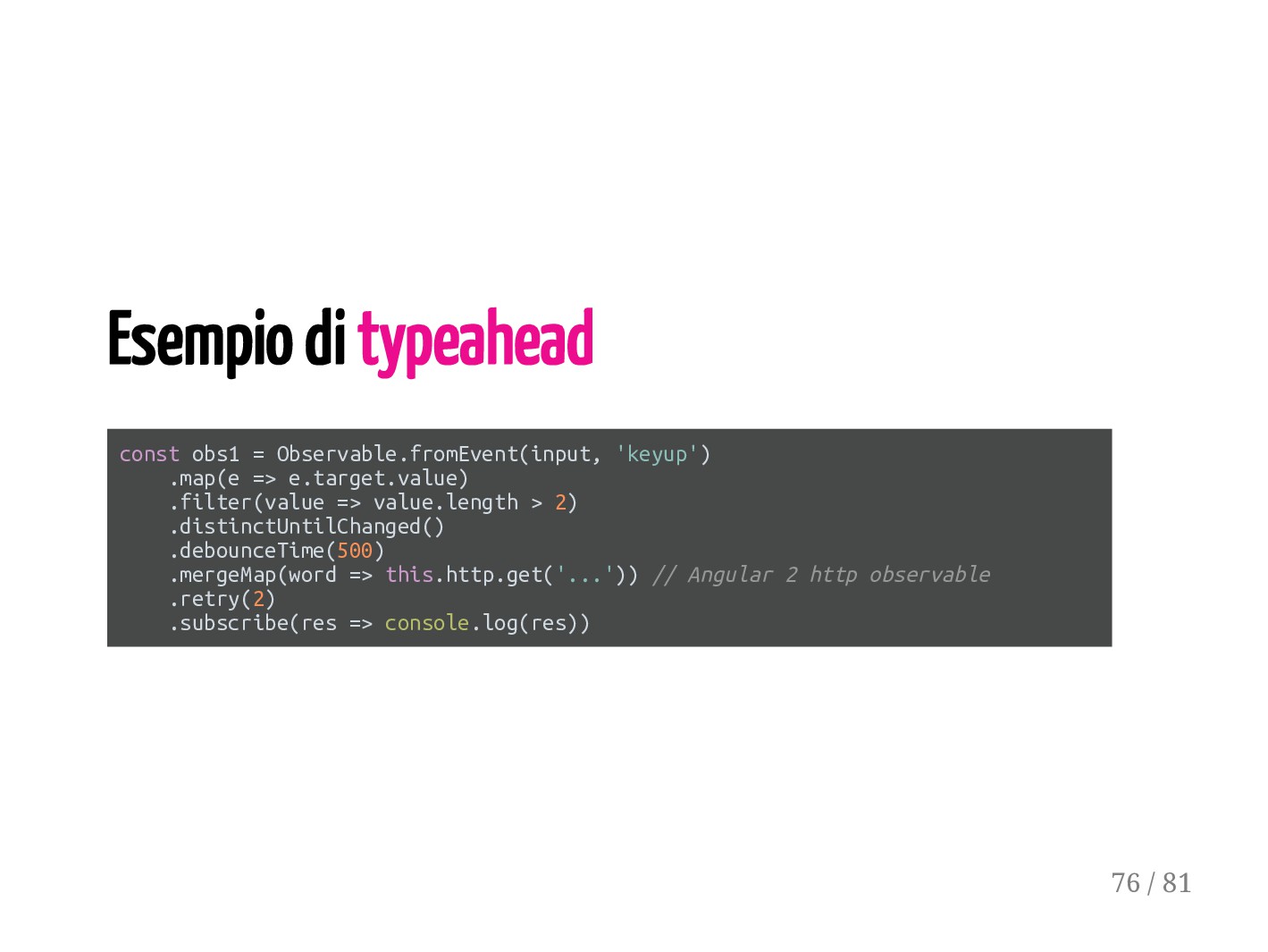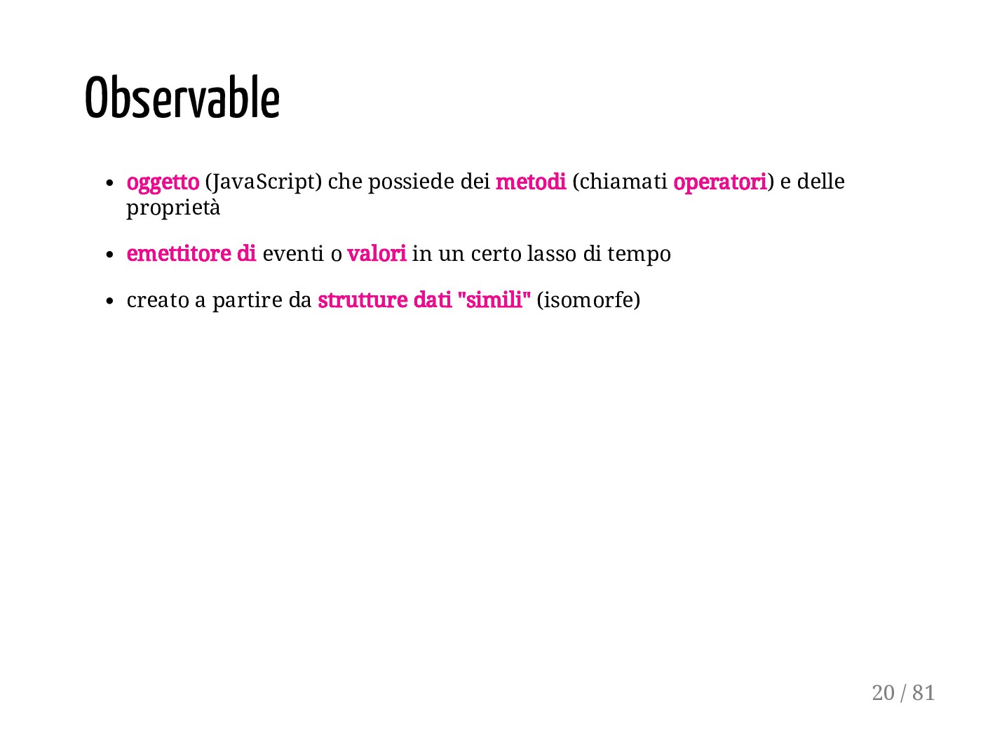 const source = ['1', '1', 'foo', '2', '3', '5', 'bar', '8', '13'] const result = source .map(x => parseInt(x)) // applica la funzione parseInt a ogni elemento //.filter(x => !isNaN(x)) //.reduce((x, y) => x + y) console.log(result) // logs: [1, 1, NaN, 2, 3, 5, NaN, 8, 13] 10 / 81