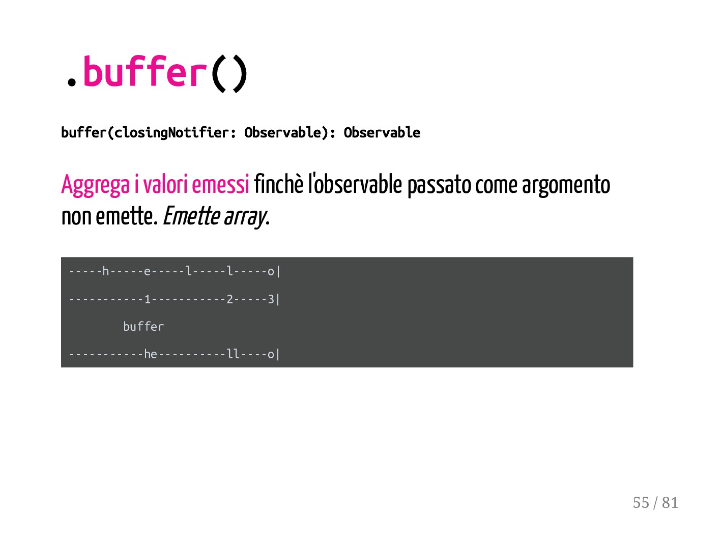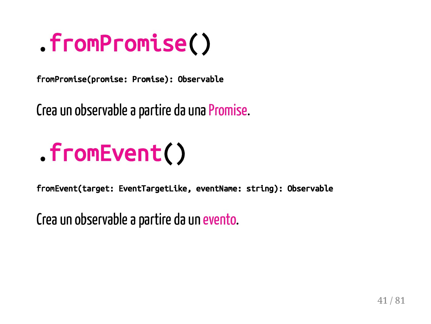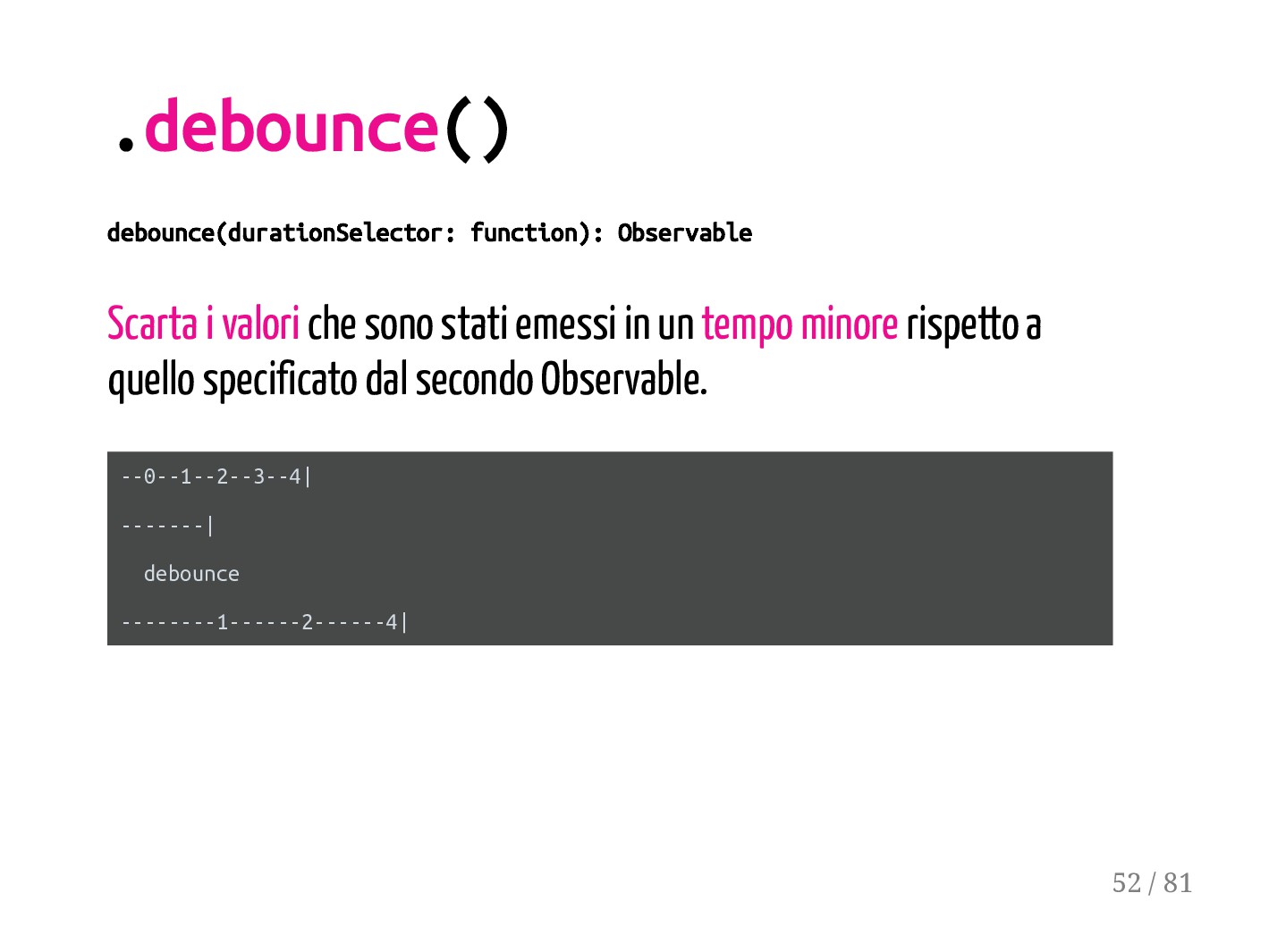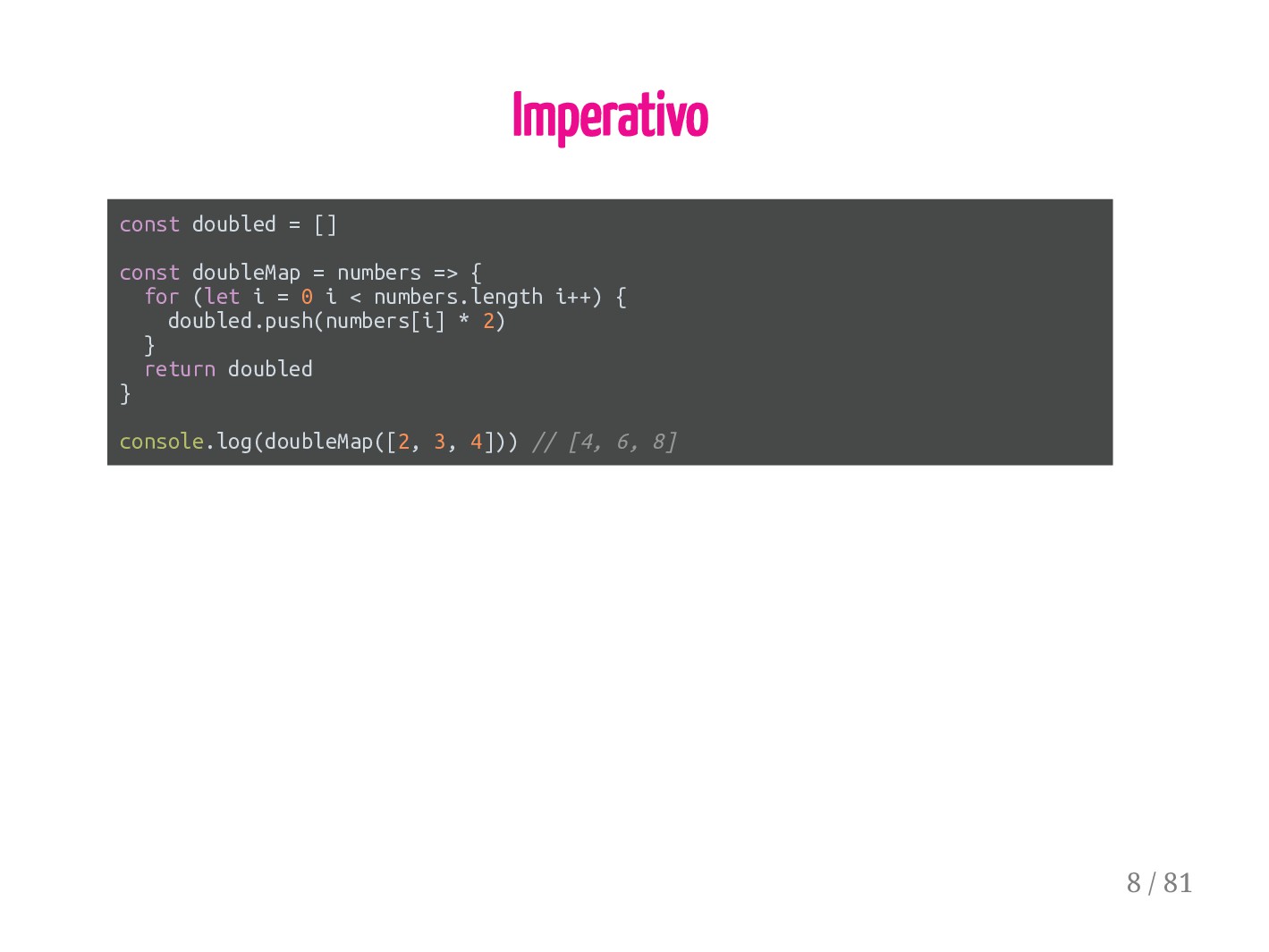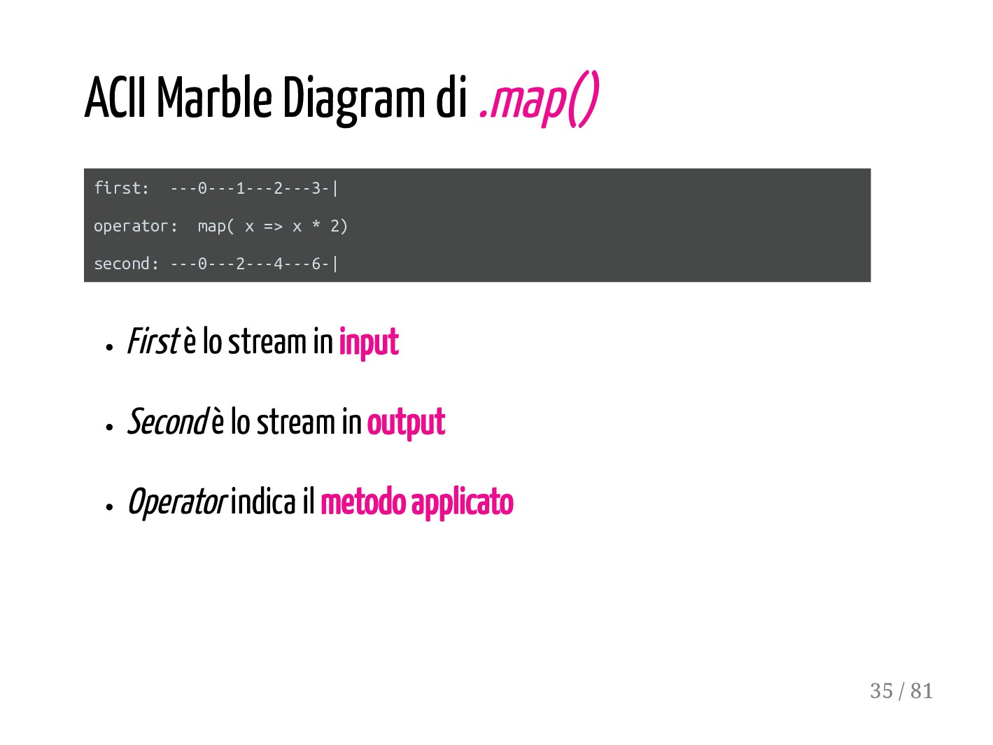 const source = ['1', '1', 'foo', '2', '3', '5', 'bar', '8', '13'] const result = source .map(x => parseInt(x)) // applica la funzione parseInt a ogni elemento //.filter(x => !isNaN(x)) //.reduce((x, y) => x + y) console.log(result) // logs: [1, 1, NaN, 2, 3, 5, NaN, 8, 13] 10 / 81