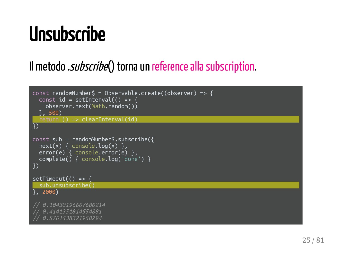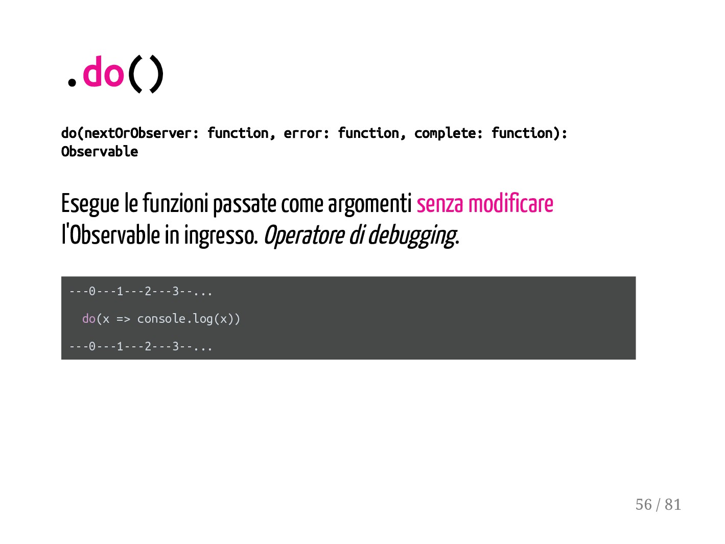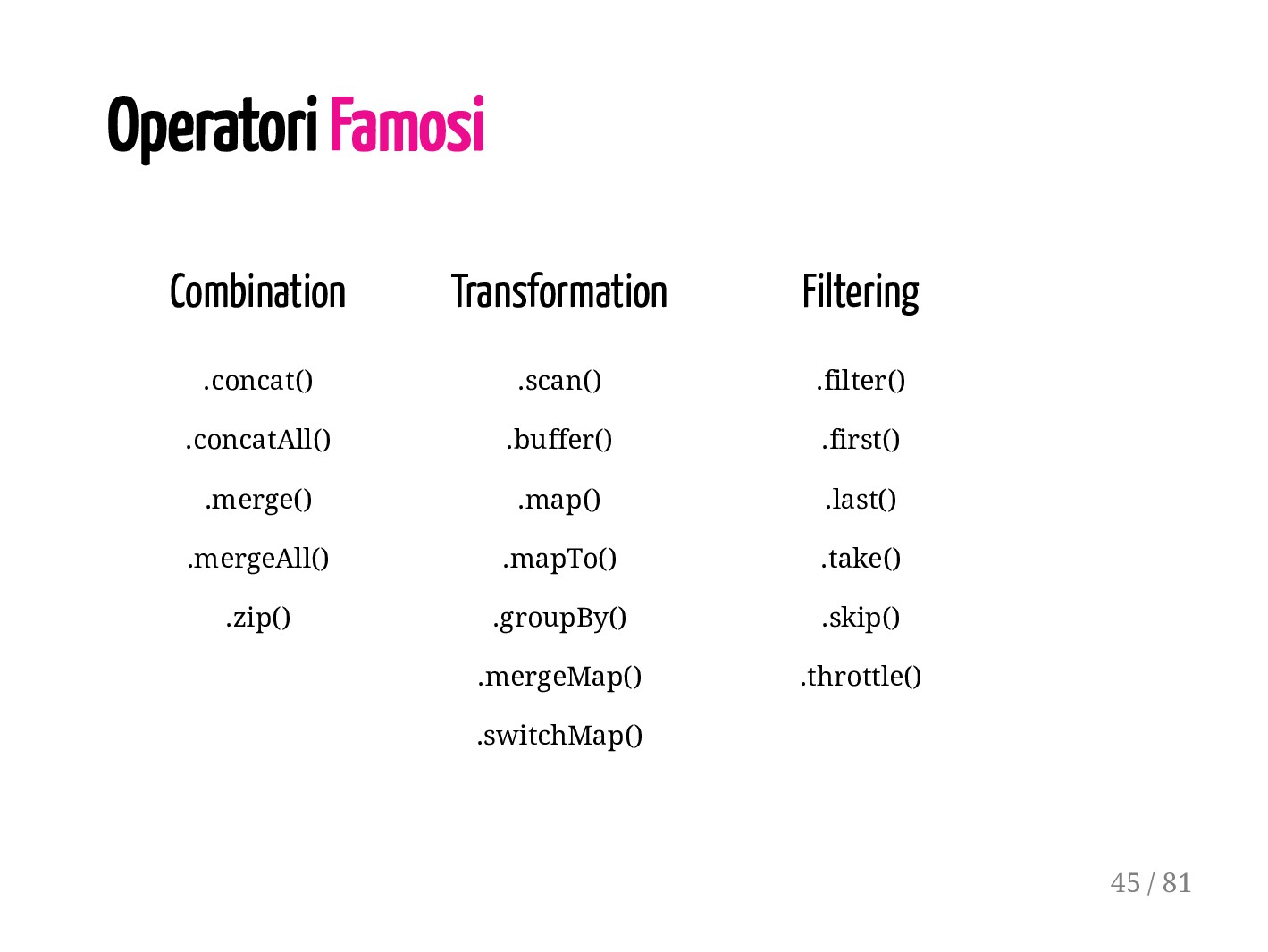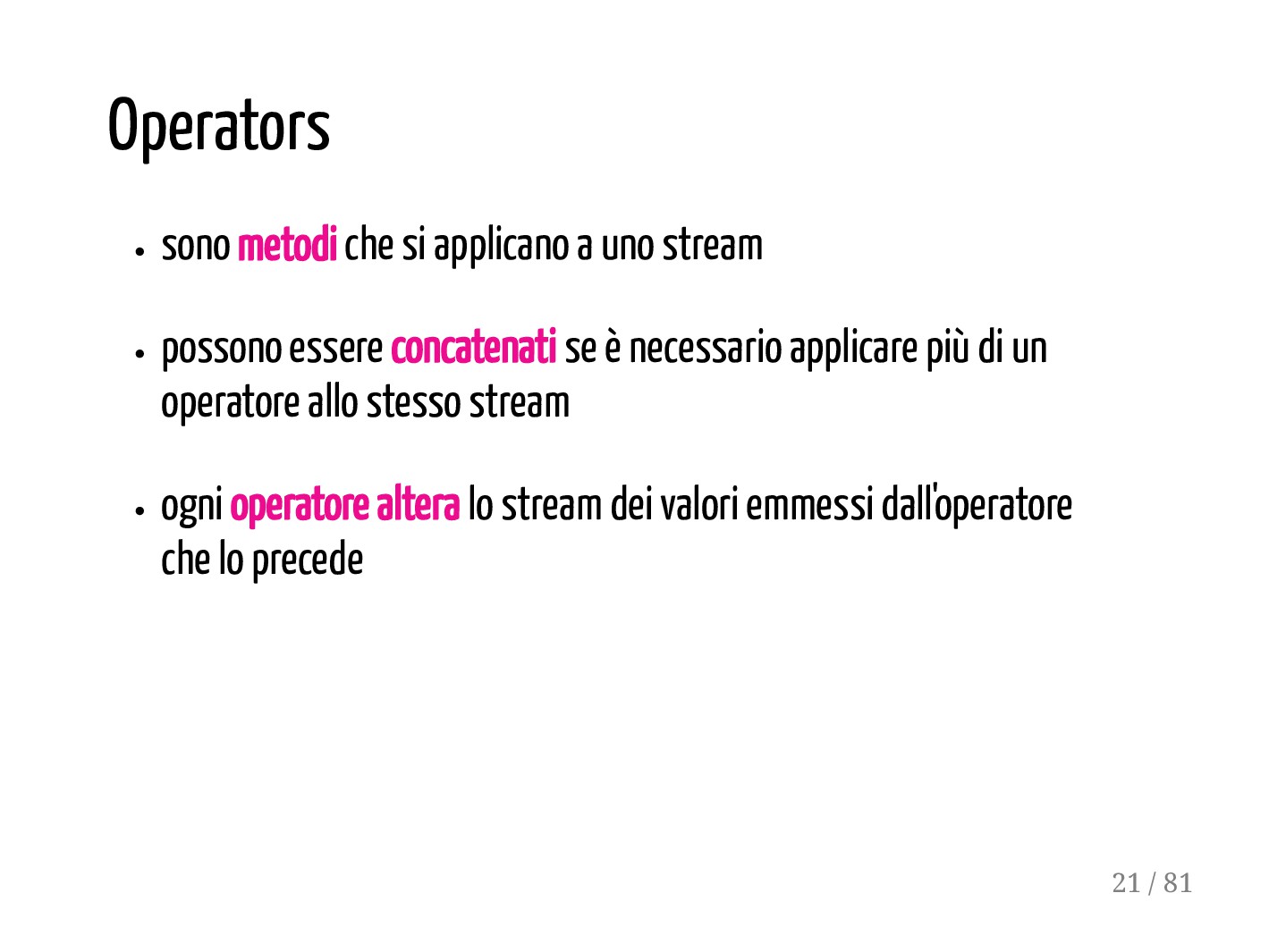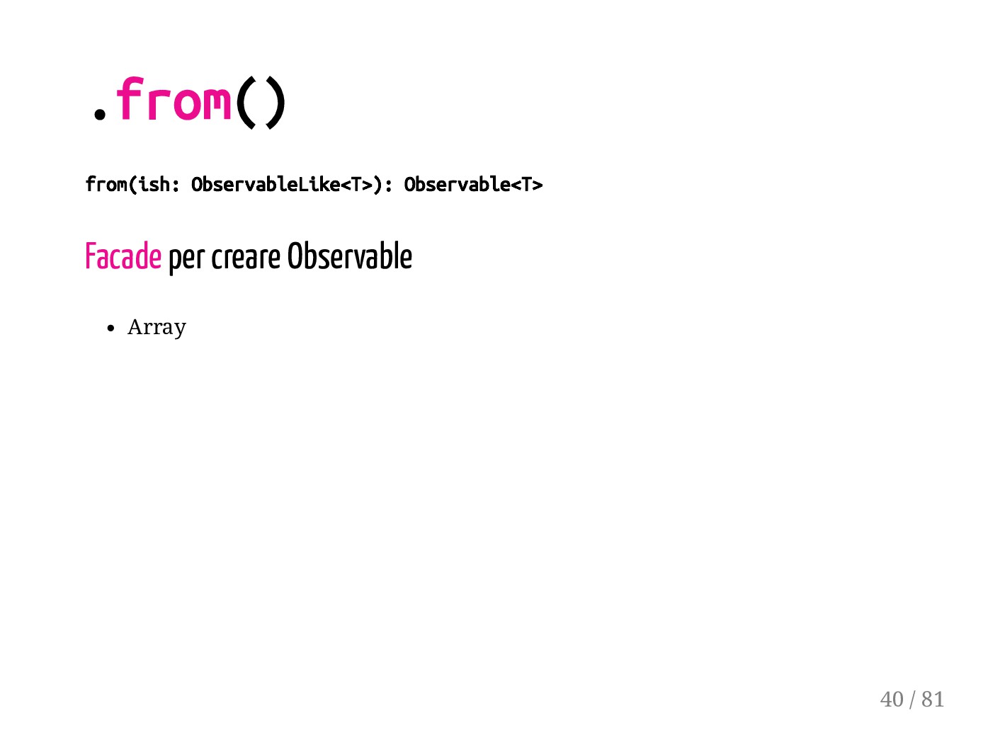 const source = ['1', '1', 'foo', '2', '3', '5', 'bar', '8', '13'] const result = source .map(x => parseInt(x)) // applica la funzione parseInt a ogni elemento //.filter(x => !isNaN(x)) //.reduce((x, y) => x + y) console.log(result) // logs: [1, 1, NaN, 2, 3, 5, NaN, 8, 13] 10 / 81