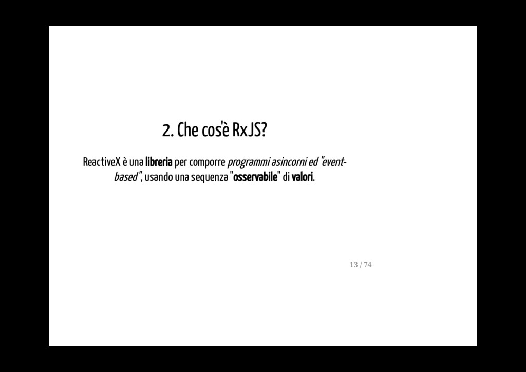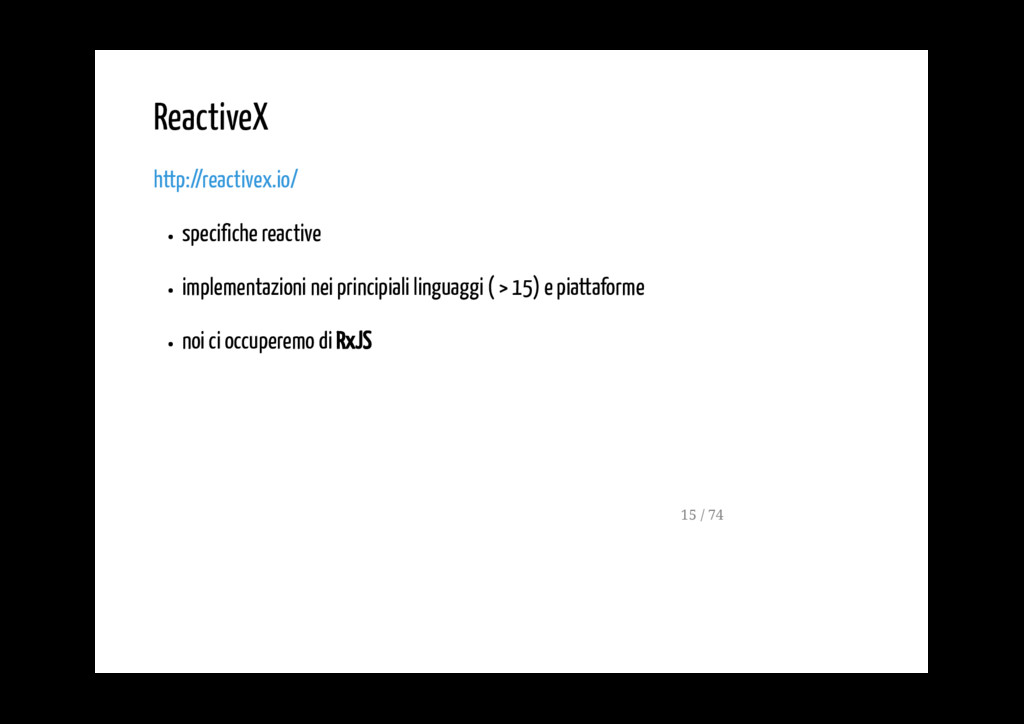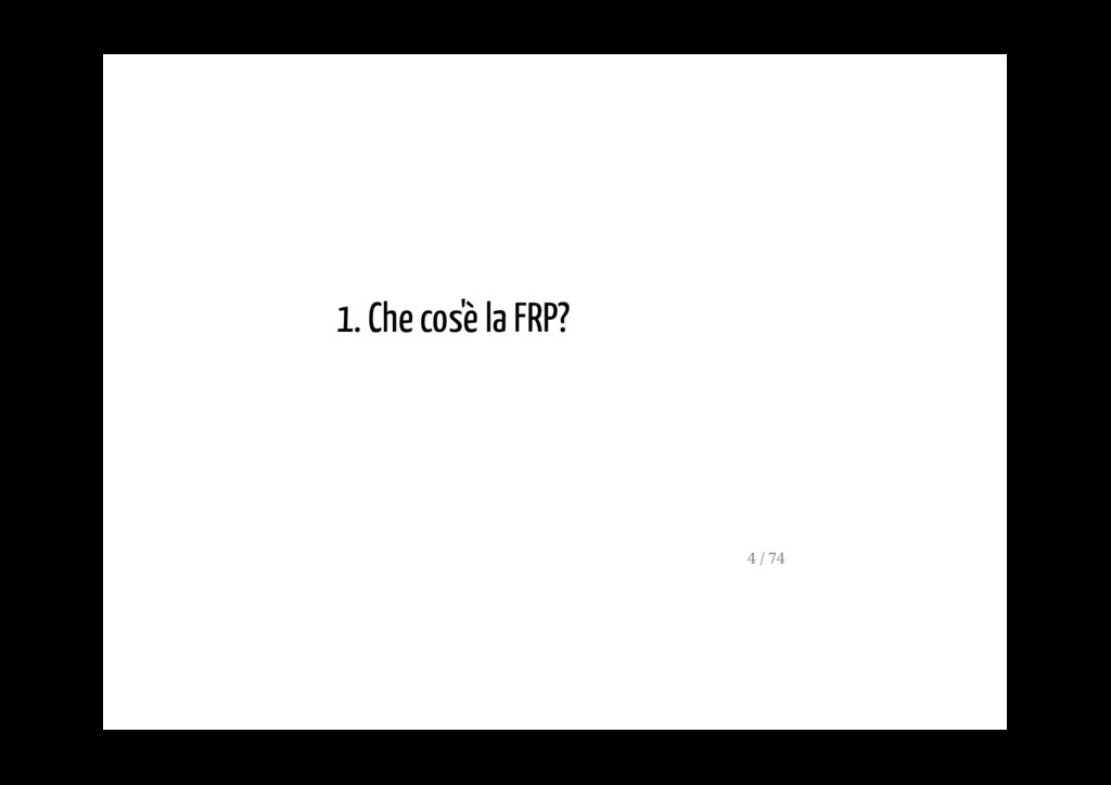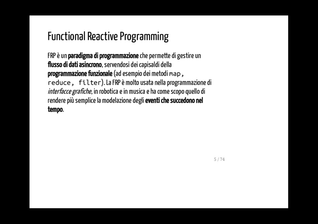 permette di gestire un flusso di dati asincrono, servendosi dei capisaldi della programmazione funzionale (ad esempio dei metodi map, reduce, filter). La FRP è molto usata nella programmazione di interfacce grafiche, in robotica e in musica e ha come scopo quello di rendere più semplice la modelazione degli eventi che succedono nel tempo. 5 / 74
