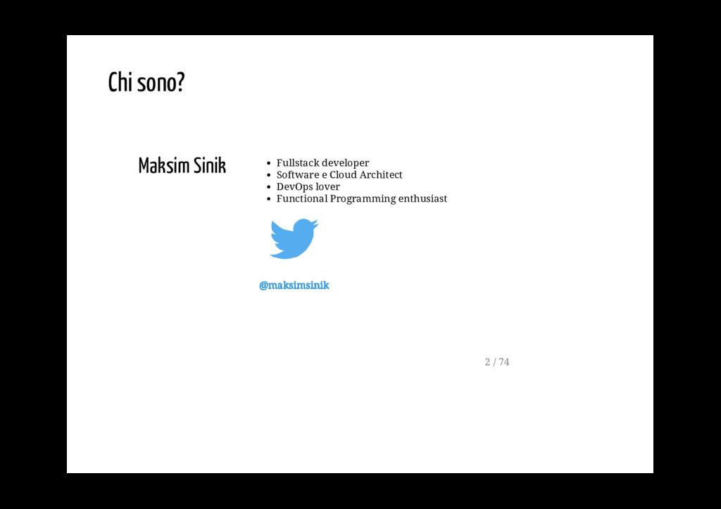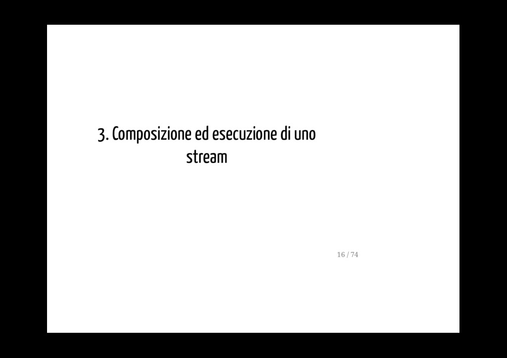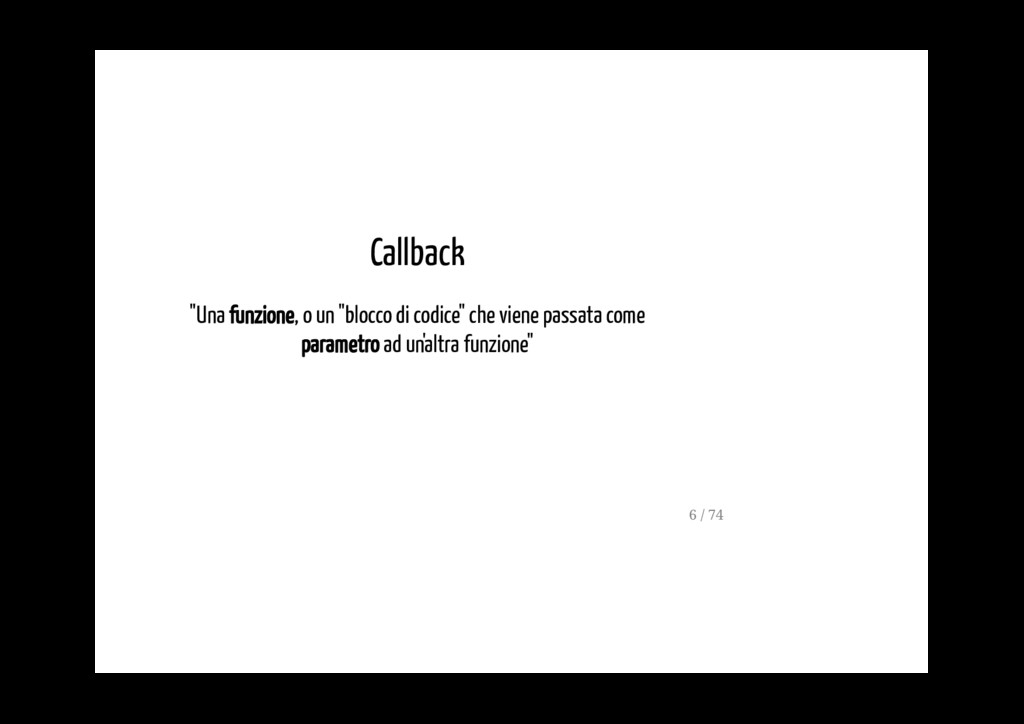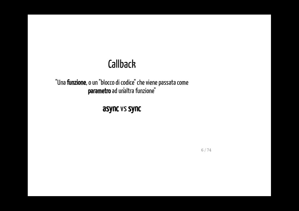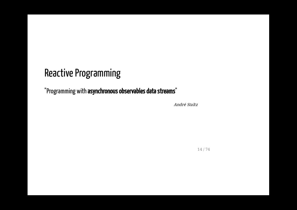 permette di gestire un flusso di dati asincrono, servendosi dei capisaldi della programmazione funzionale (ad esempio dei metodi map, reduce, filter). La FRP è molto usata nella programmazione di interfacce grafiche, in robotica e in musica e ha come scopo quello di rendere più semplice la modelazione degli eventi che succedono nel tempo. 5 / 74