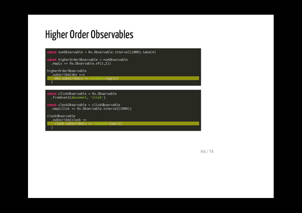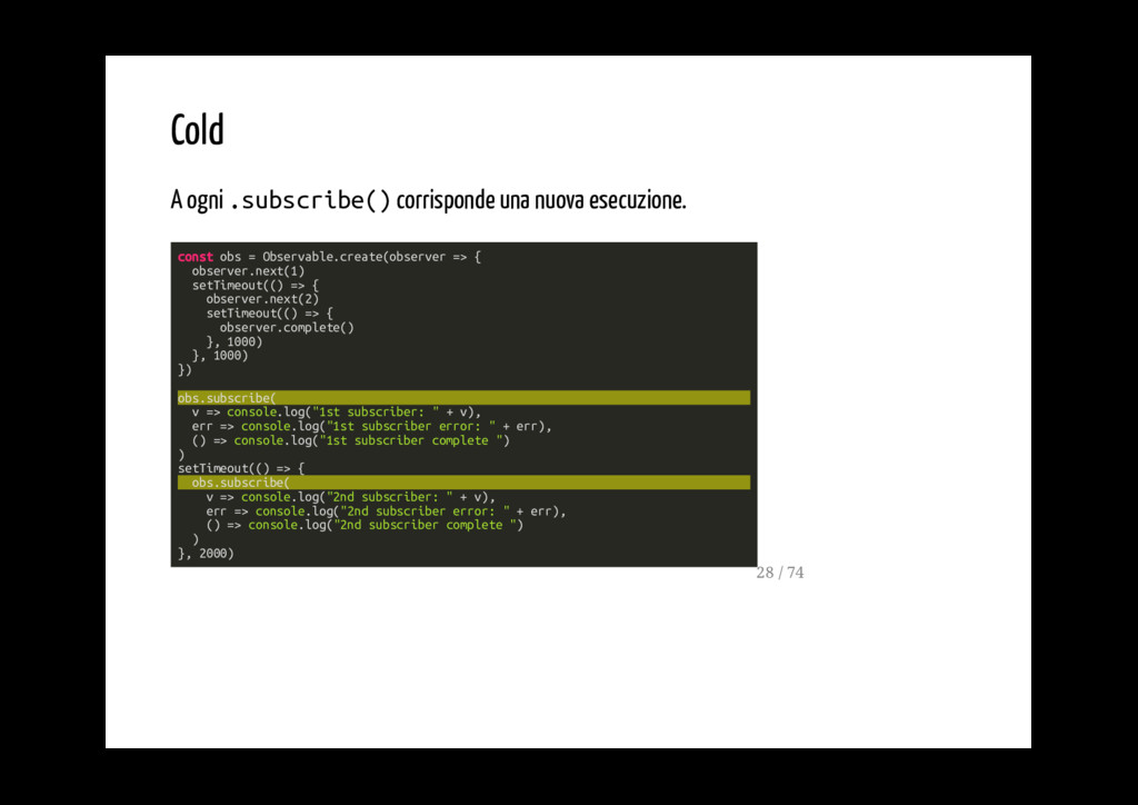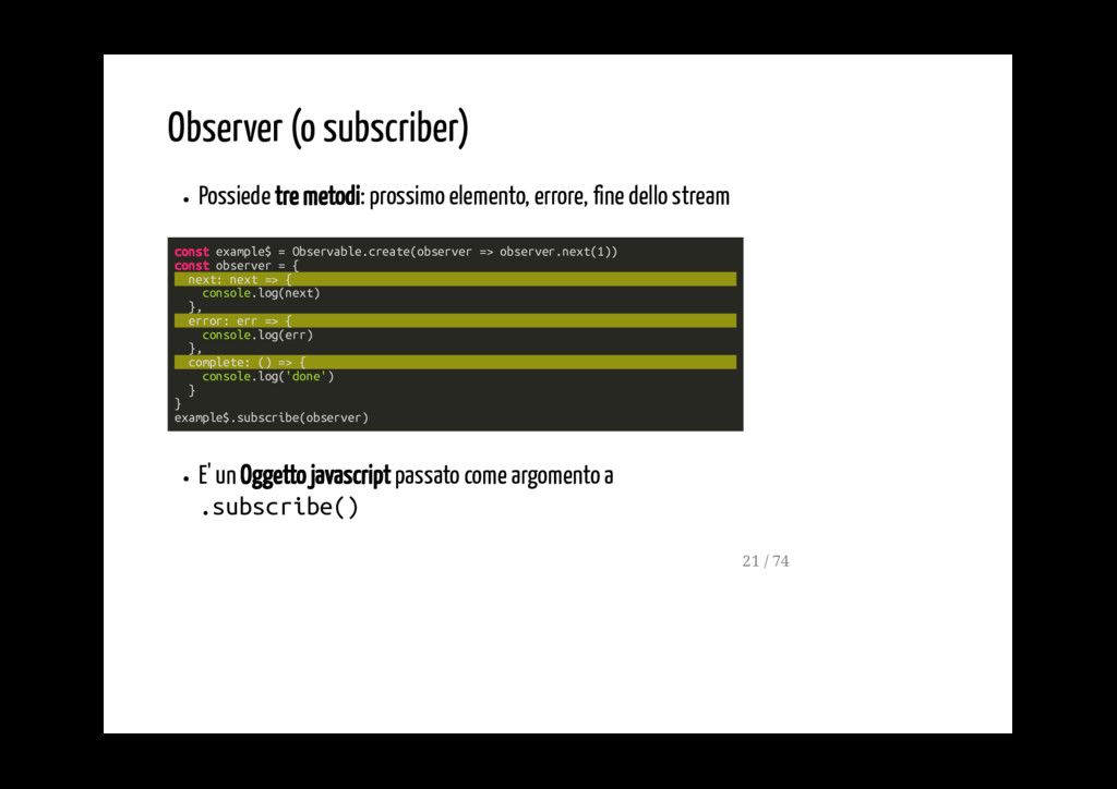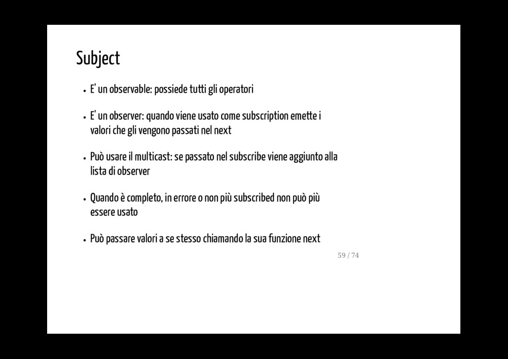 observer: quando viene usato come subscription emette i valori che gli vengono passati nel next Può usare il multicast: se passato nel subscribe viene aggiunto alla lista di observer Quando è completo, in errore o non più subscribed non può più essere usato Può passare valori a se stesso chiamando la sua funzione next 59 / 74