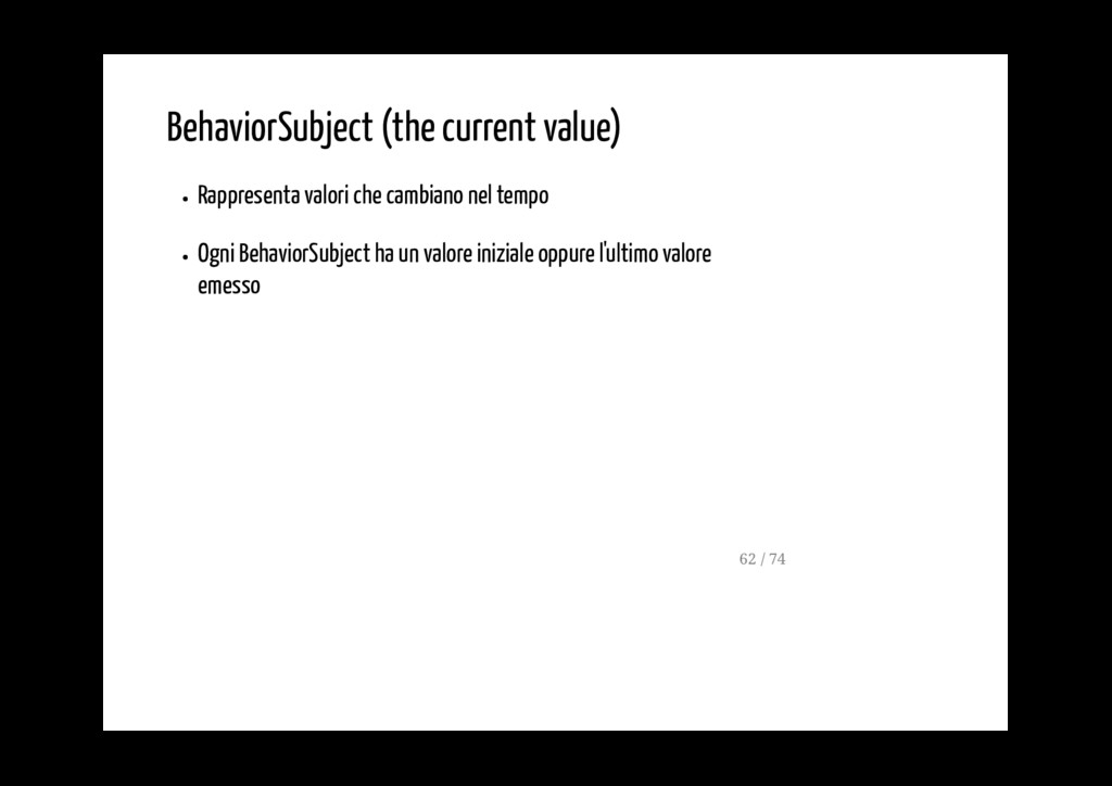 Ogni BehaviorSubject ha un valore iniziale oppure l'ultimo valore emesso Nei Service di Angular si usa spesso il behavior subject per la gestione dei dati. Infatti, il servizio spesso si inzializza prima del component e il behavior subject ci garantisce che ci sarà un valore inziiale che poi verrà aggiornato appena ce ne sarà disponbile uno più recente. 62 / 74
