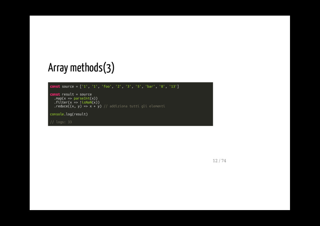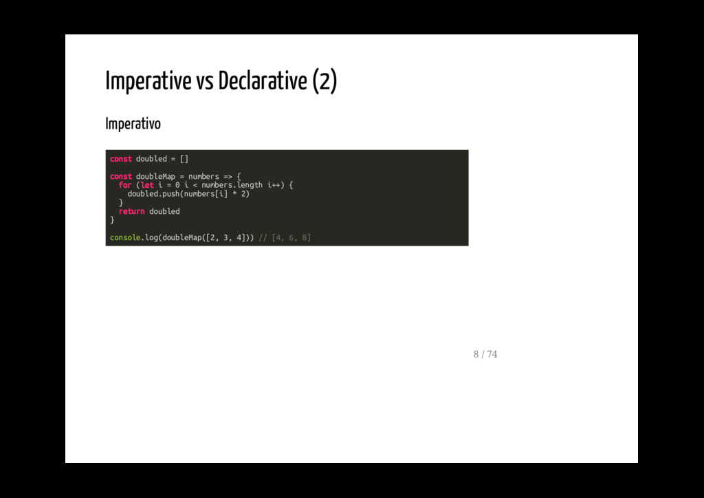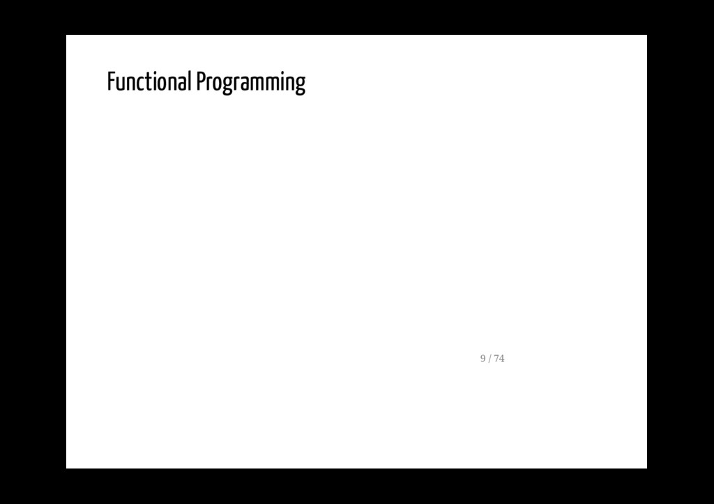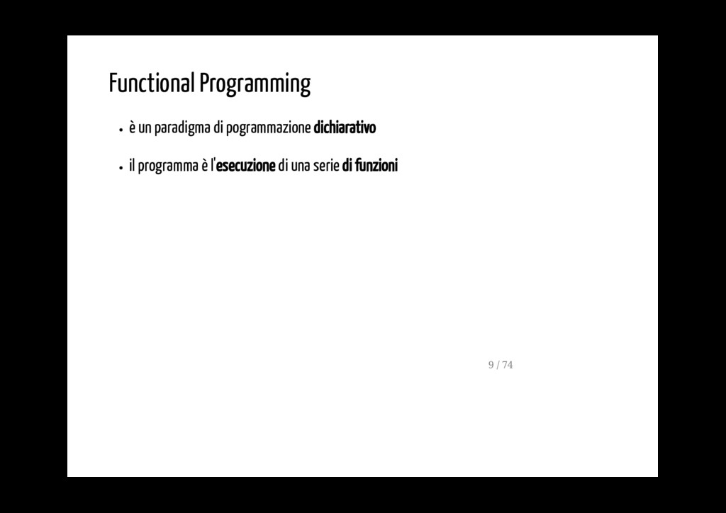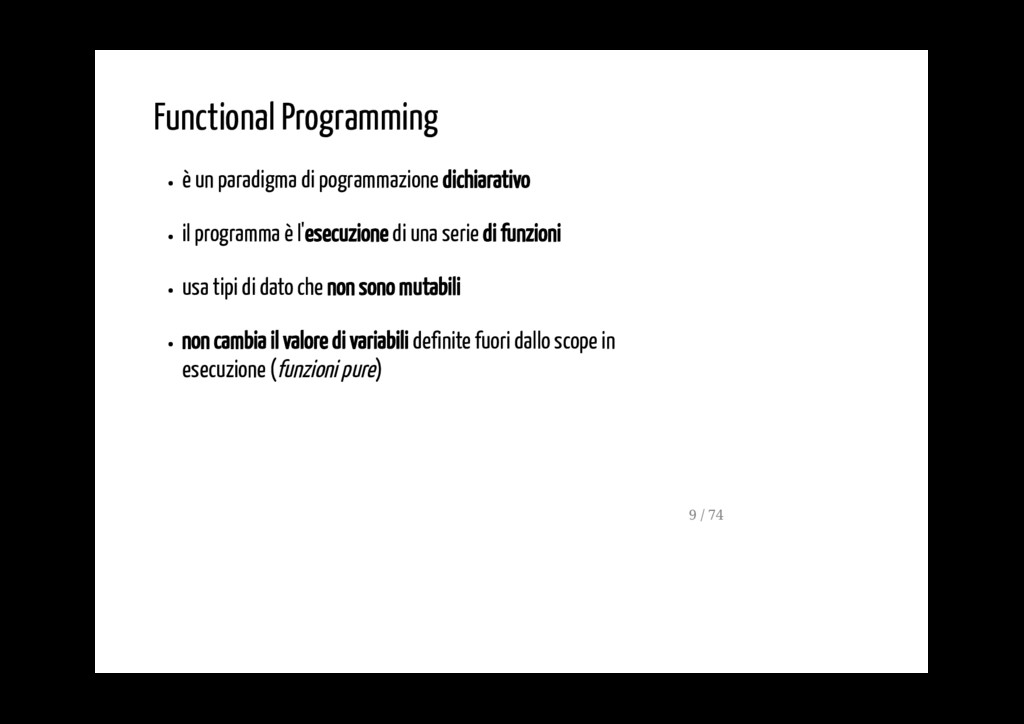 è l'esecuzione di una serie di funzioni usa tipi di dato che non sono mutabili non cambia il valore di variabili definite fuori dallo scope in esecuzione (funzioni pure) 9 / 74