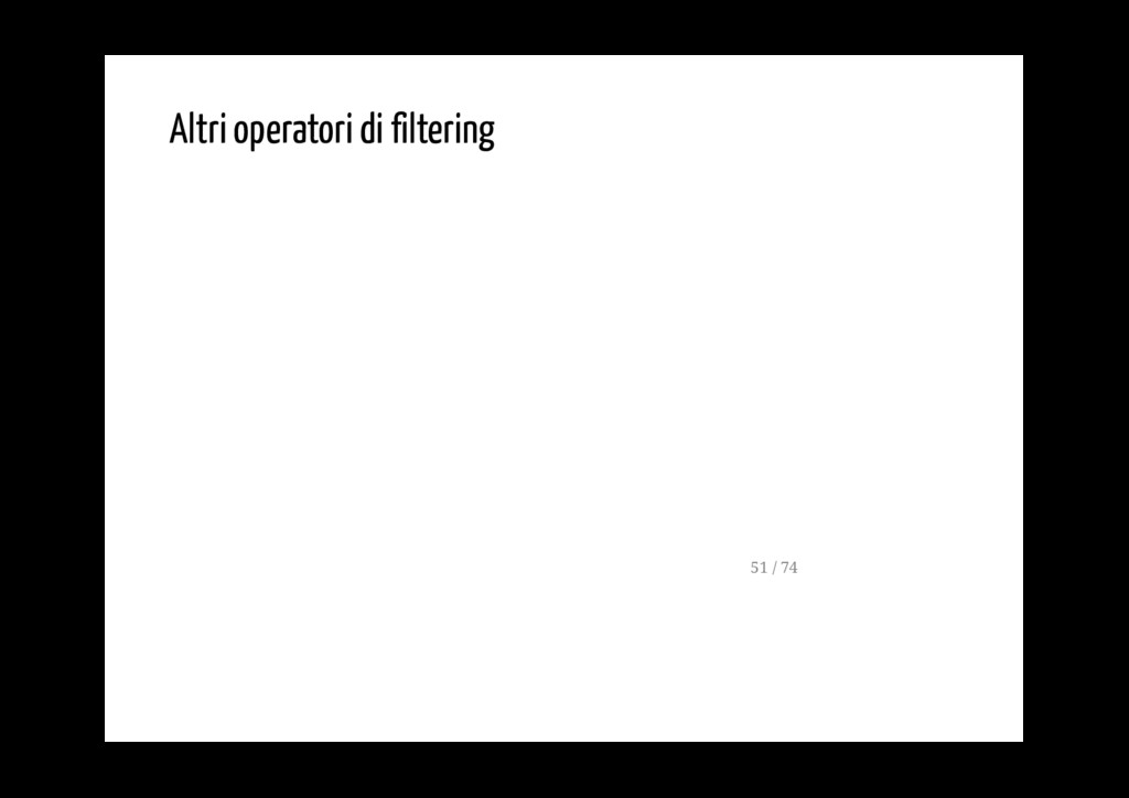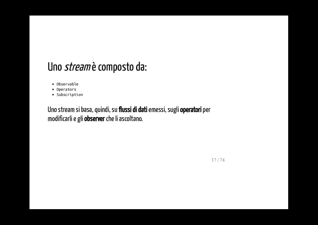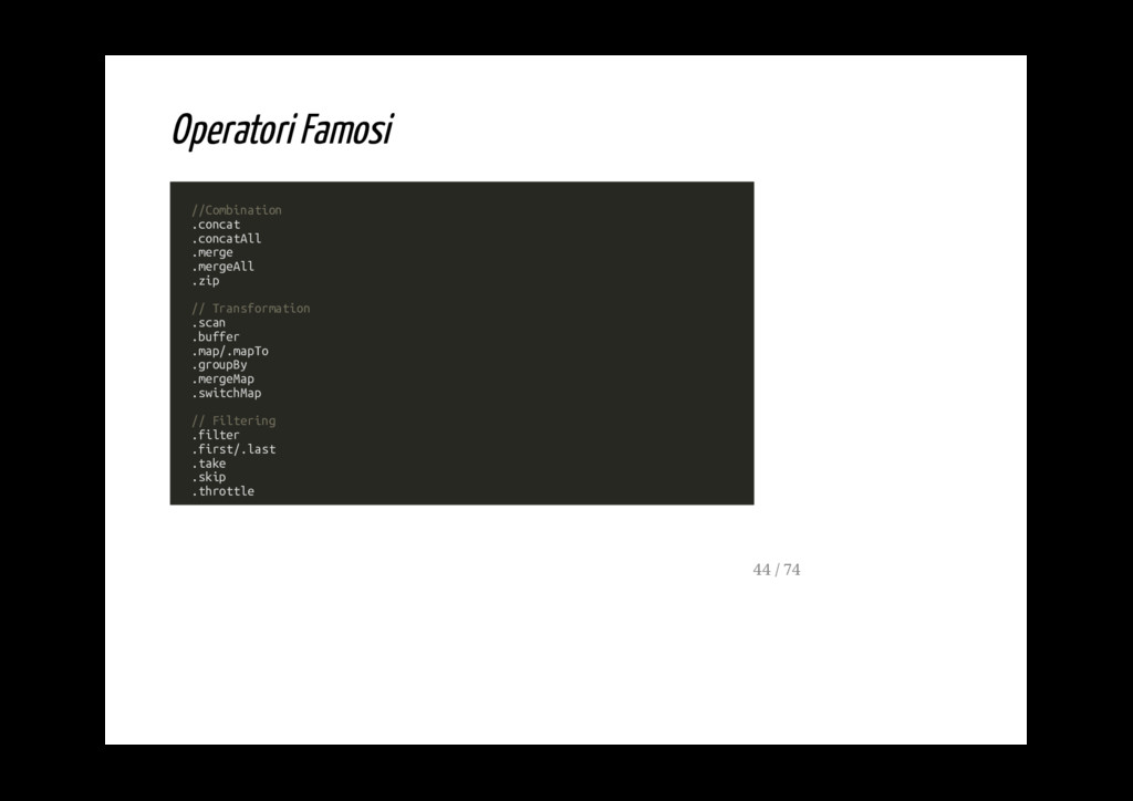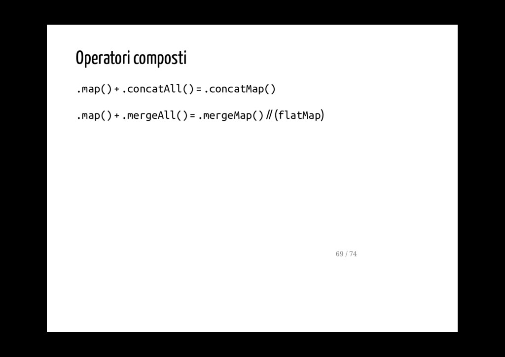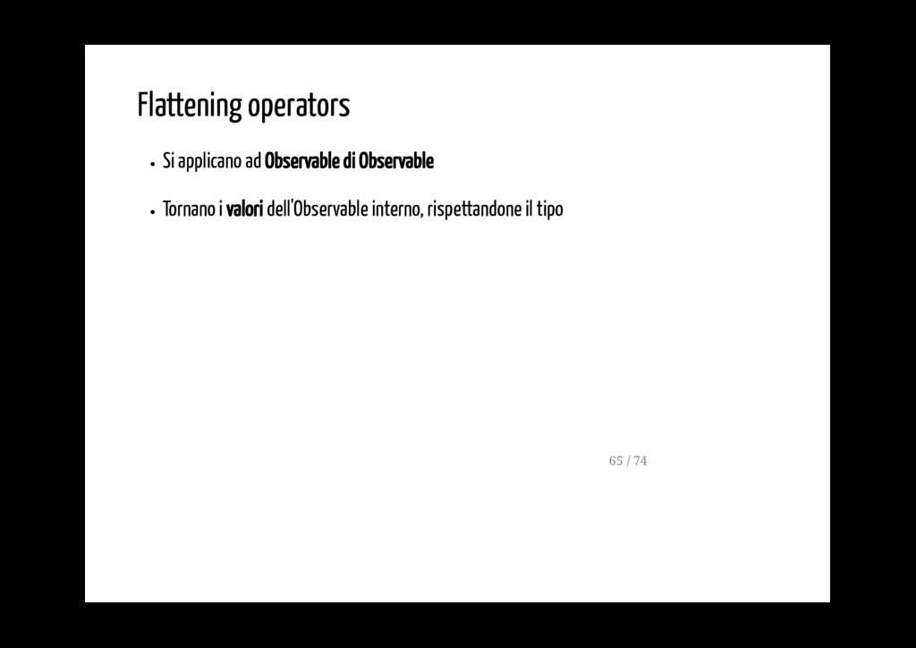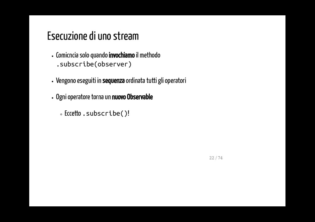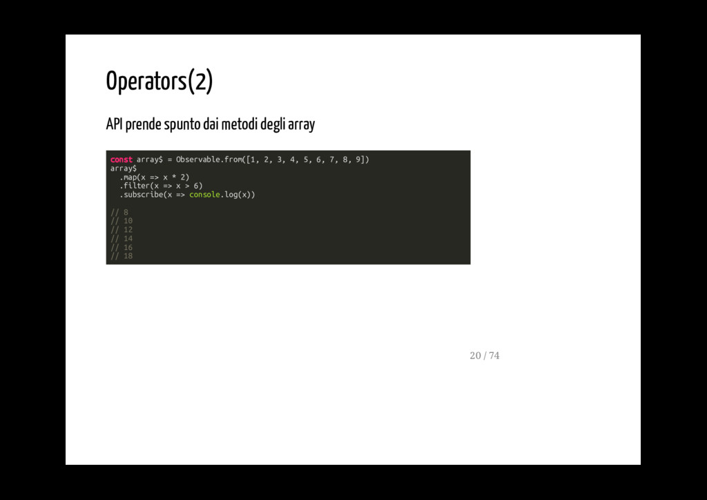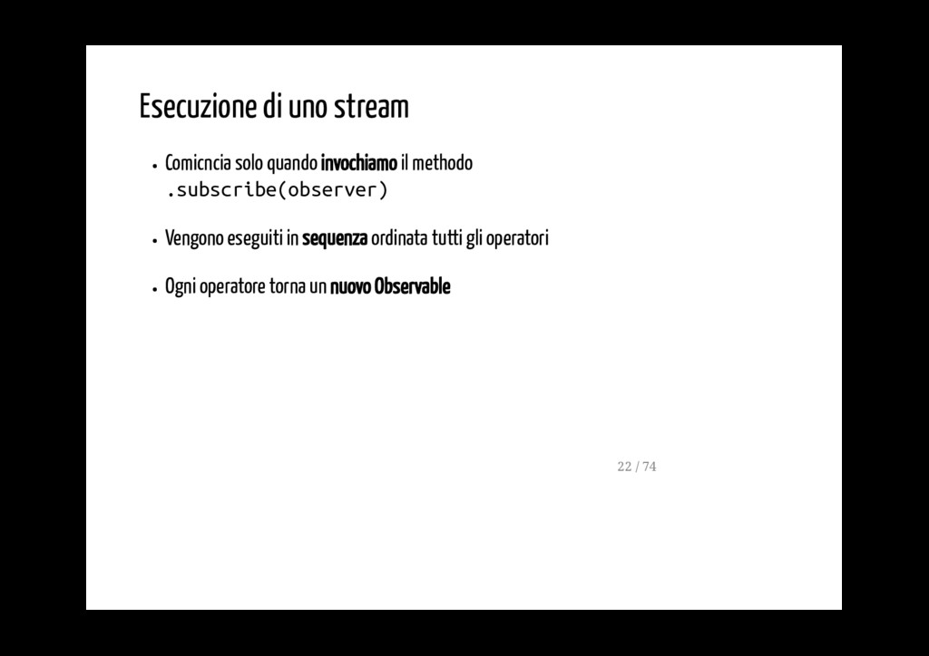 - possono essere concatenati se è necessario applicare più di un operatore - ogni operatore modifica lo stream dei valori emmessi dall'operatore che lo precede - ogni operatore produce un nuovo Observable (stream) 19 / 74