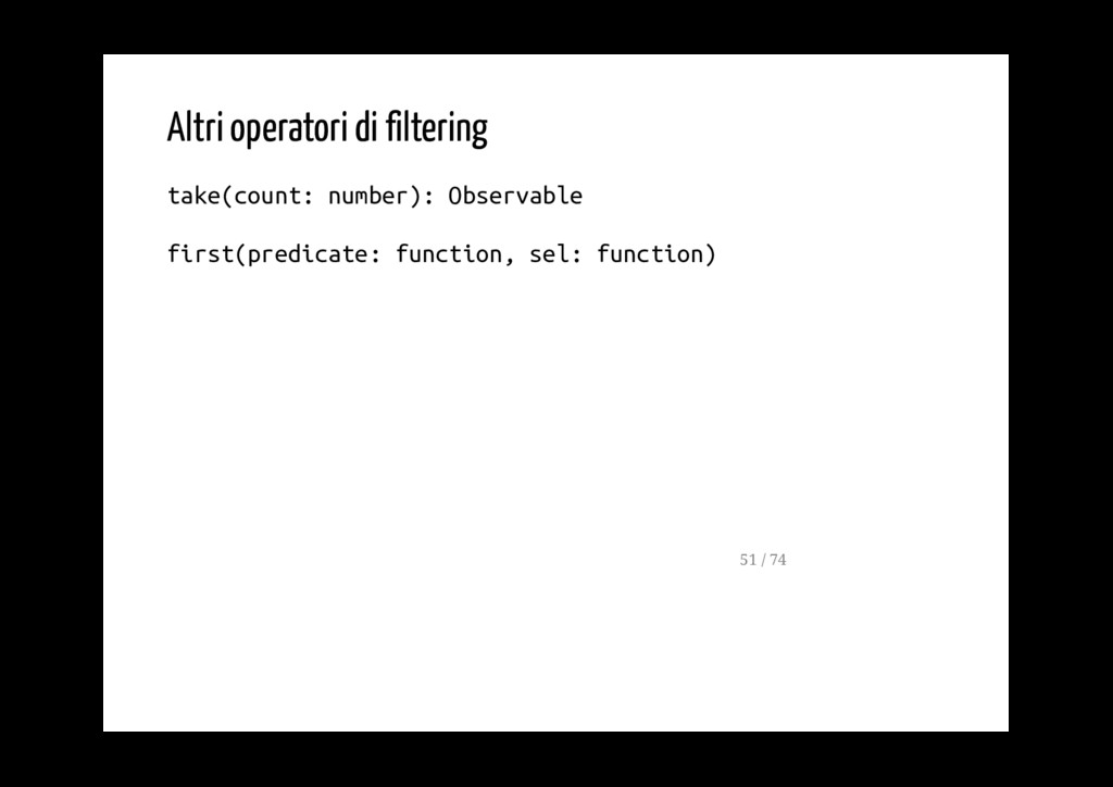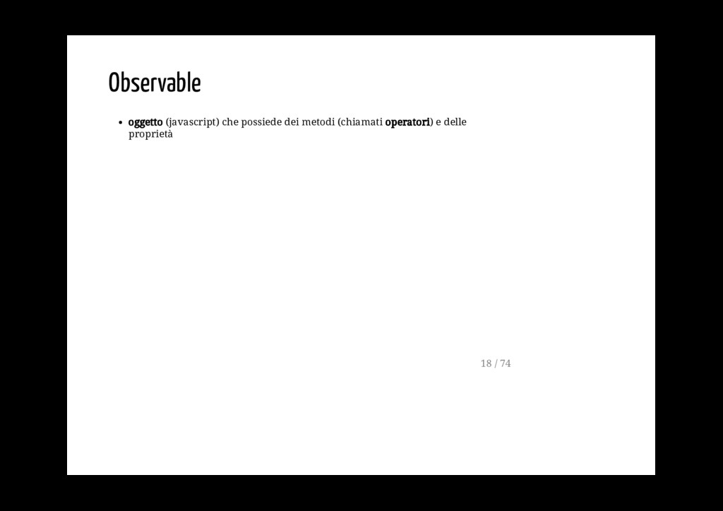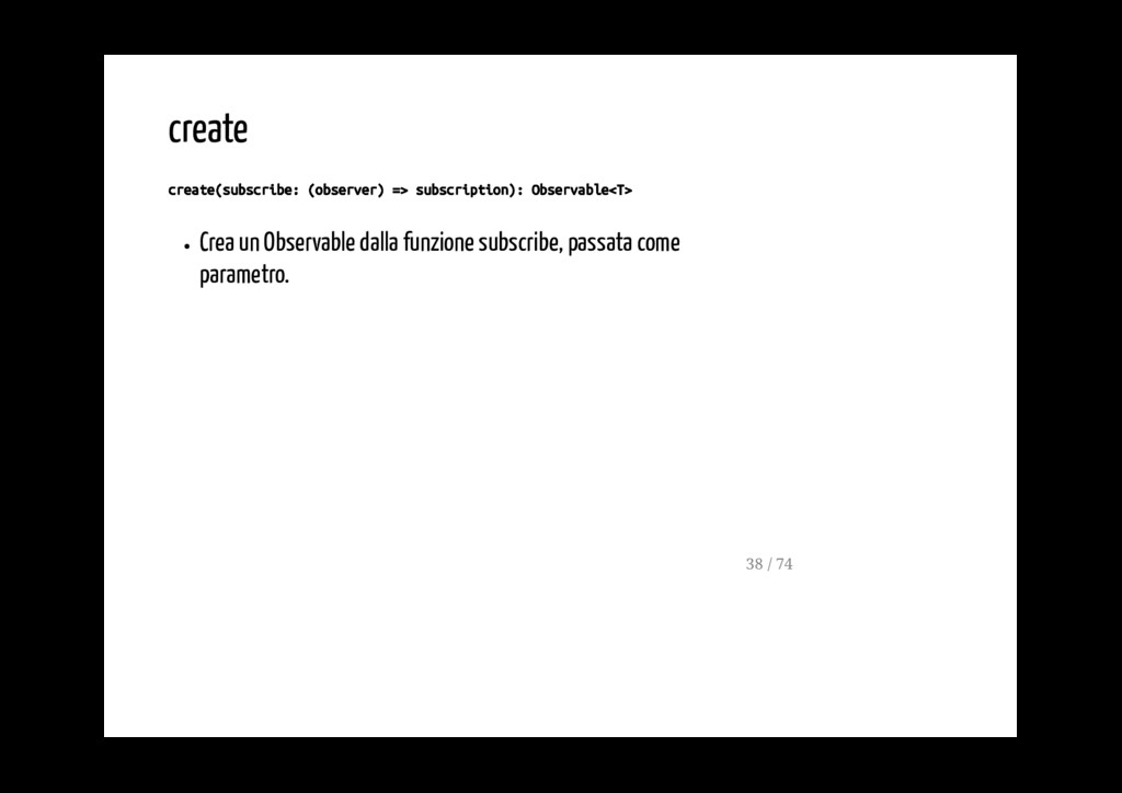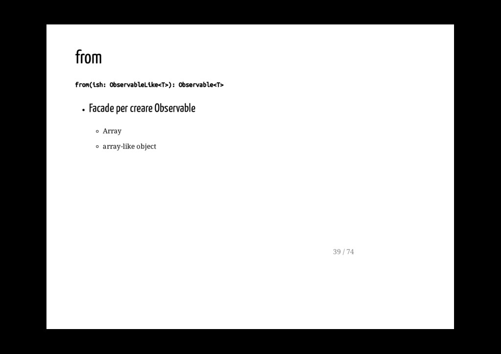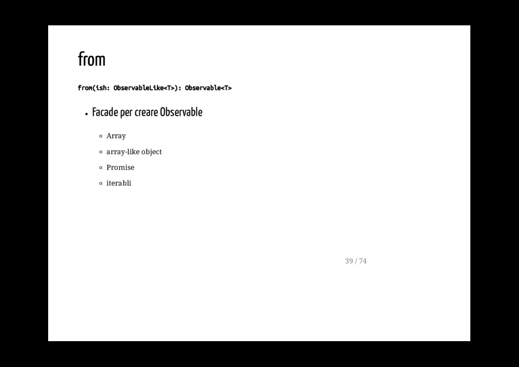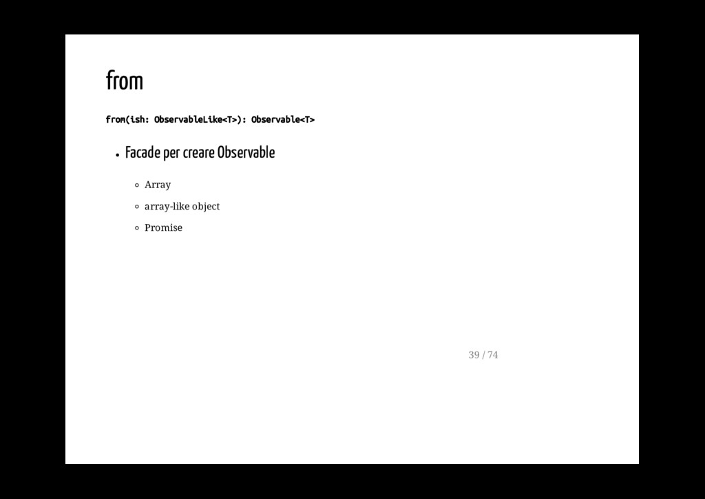 Promise. fromPromise(promise: Promise): Observable Crea un observable a partire da un evento. fromEvent(target: EventTargetLike, eventName: string): Observable 40 / 74