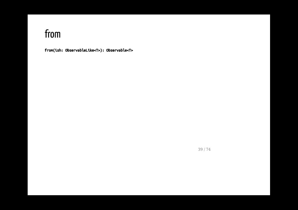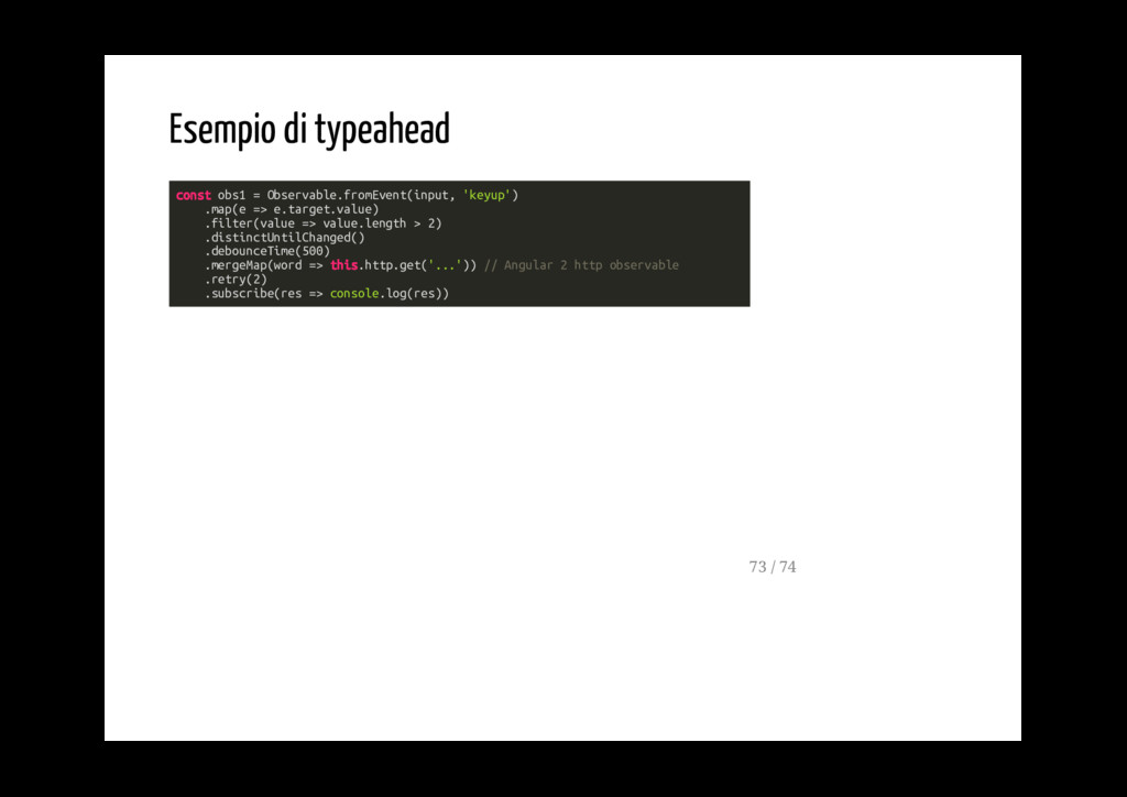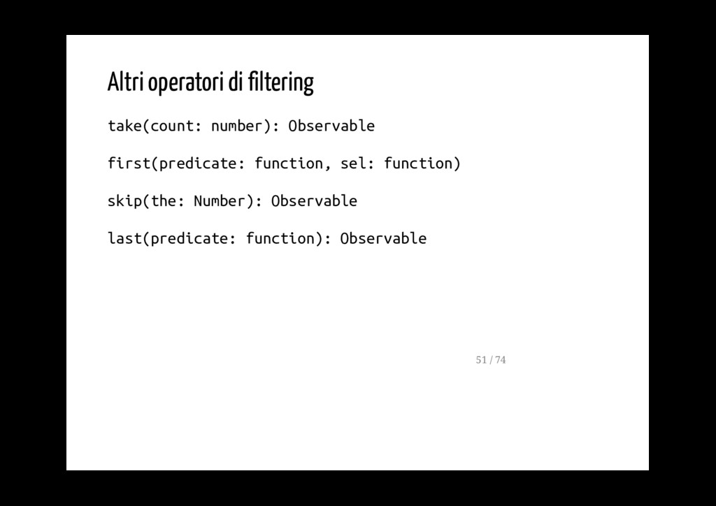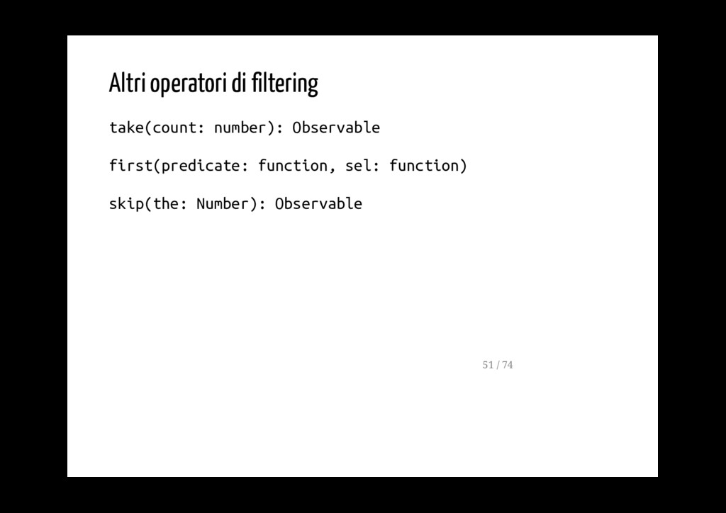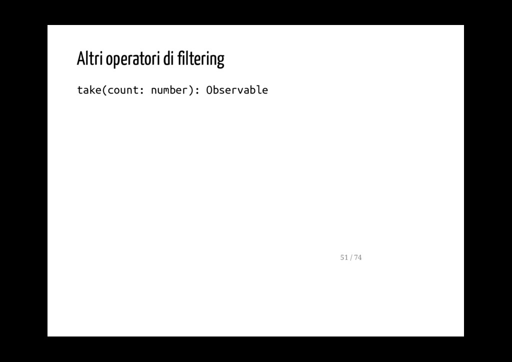 Promise. fromPromise(promise: Promise): Observable Crea un observable a partire da un evento. fromEvent(target: EventTargetLike, eventName: string): Observable 40 / 74