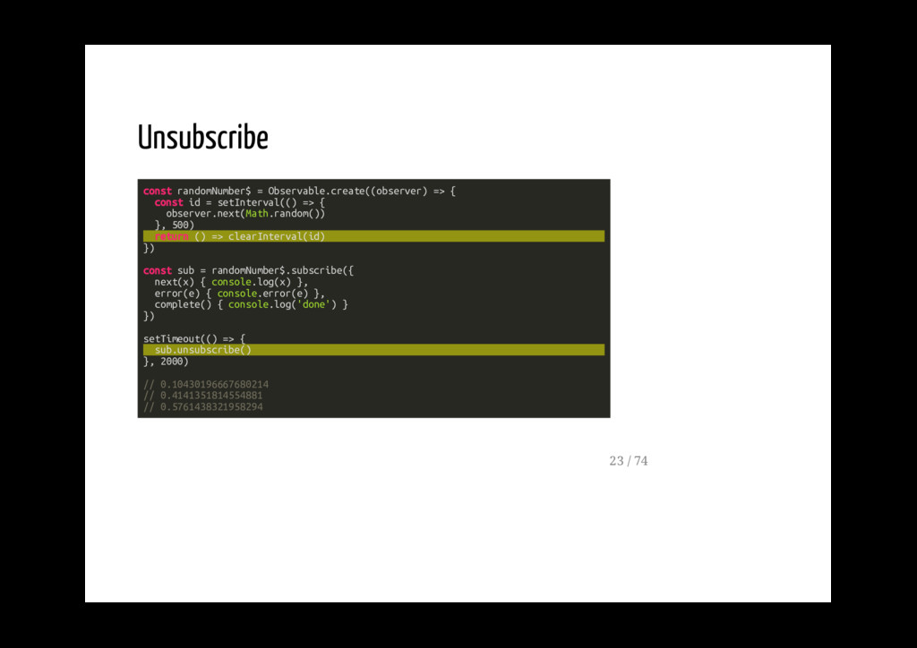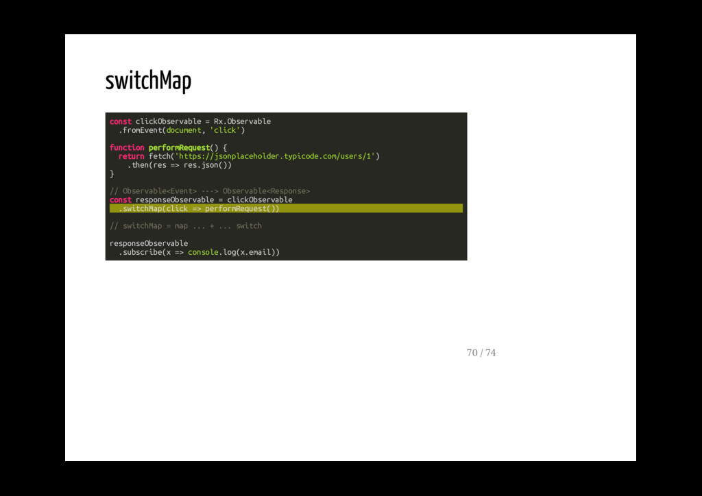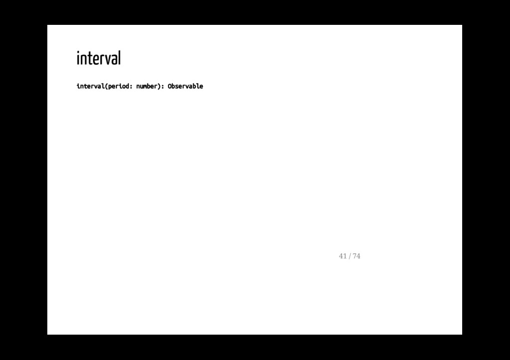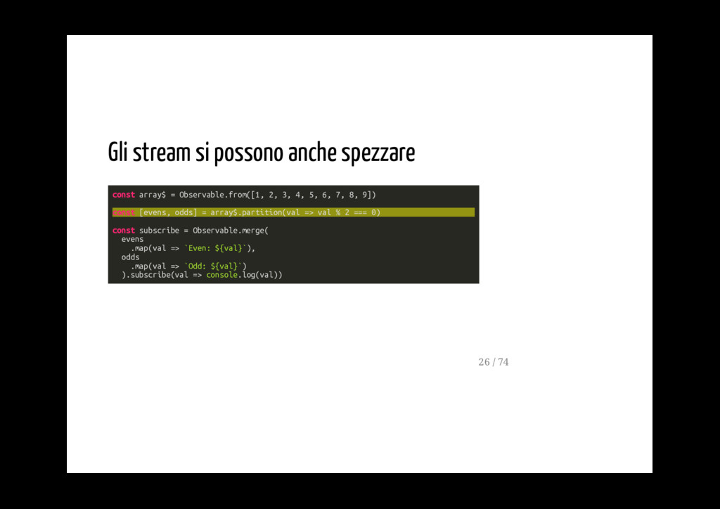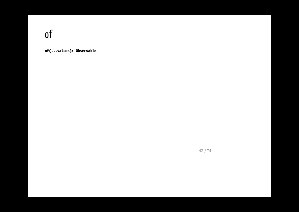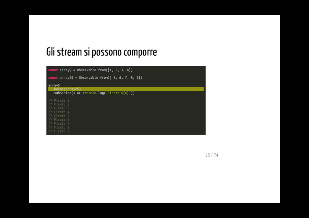 Promise. fromPromise(promise: Promise): Observable Crea un observable a partire da un evento. fromEvent(target: EventTargetLike, eventName: string): Observable 40 / 74