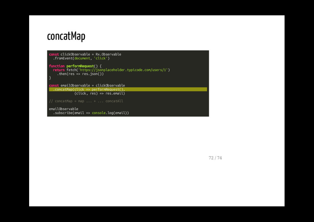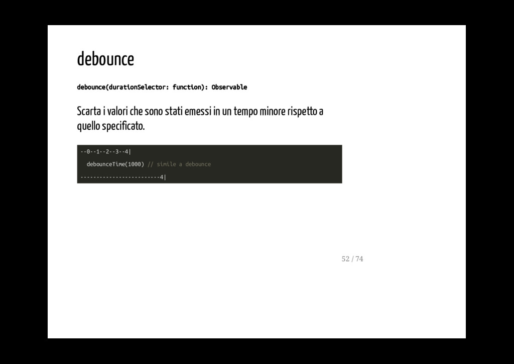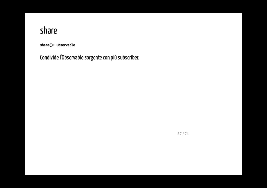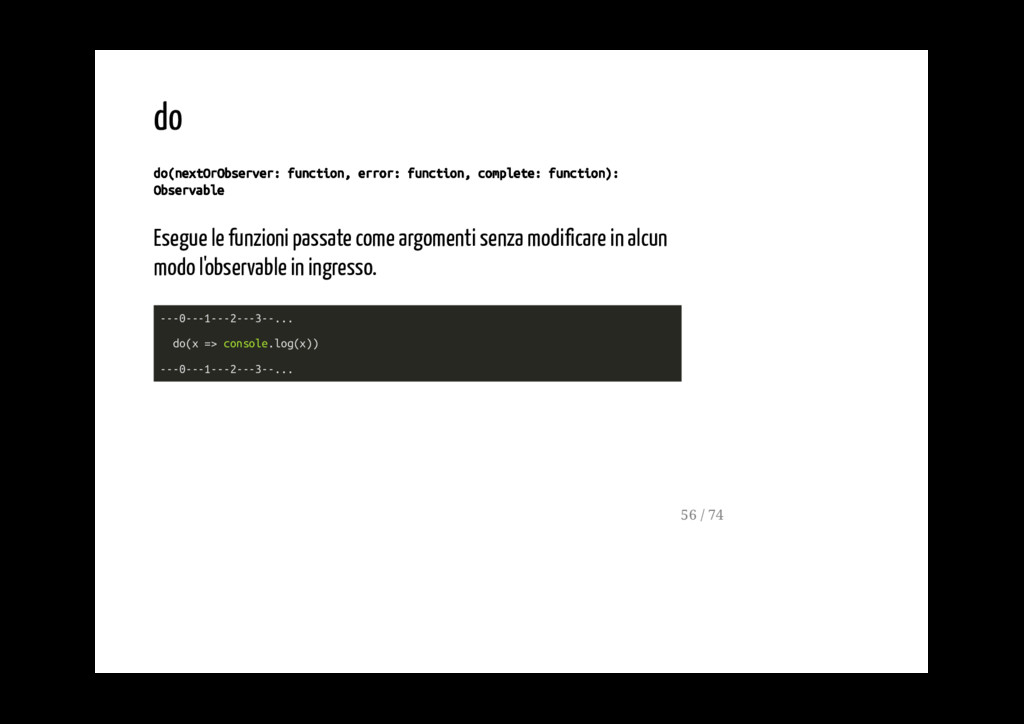 funzioni passate come argomenti senza modificare in alcun modo l'observable in ingresso. ---0---1---2---3--... do(x => console.log(x)) ---0---1---2---3--... 56 / 74