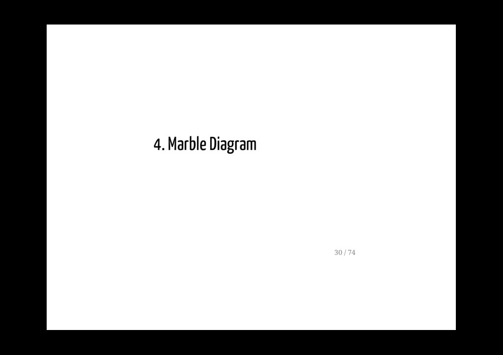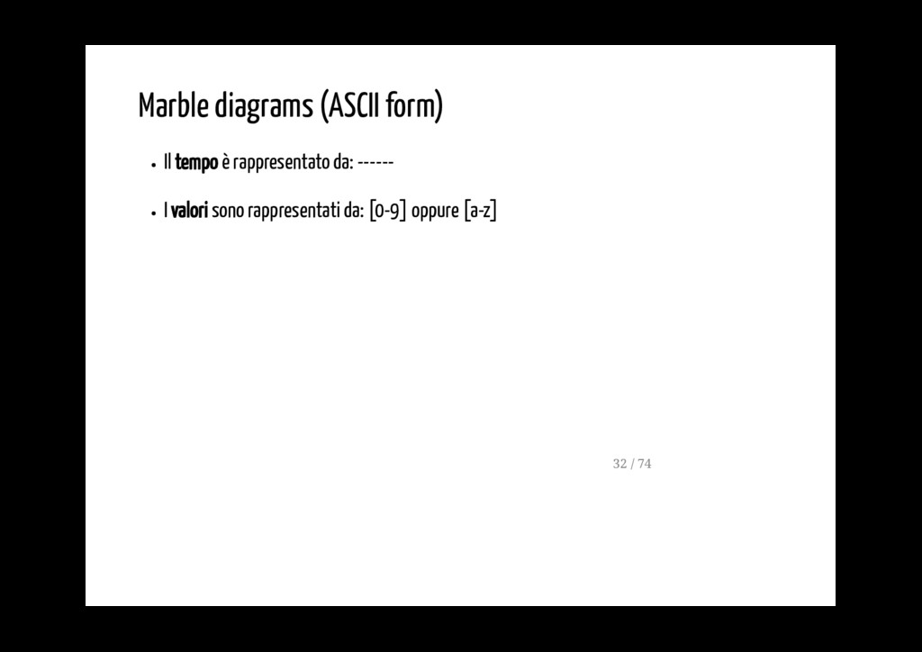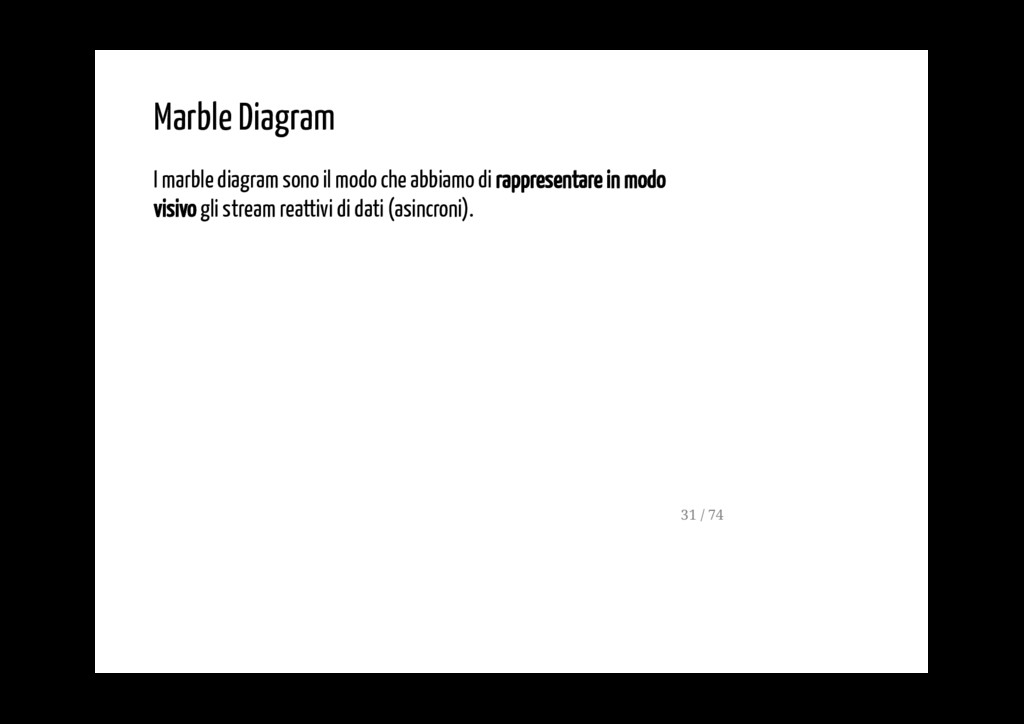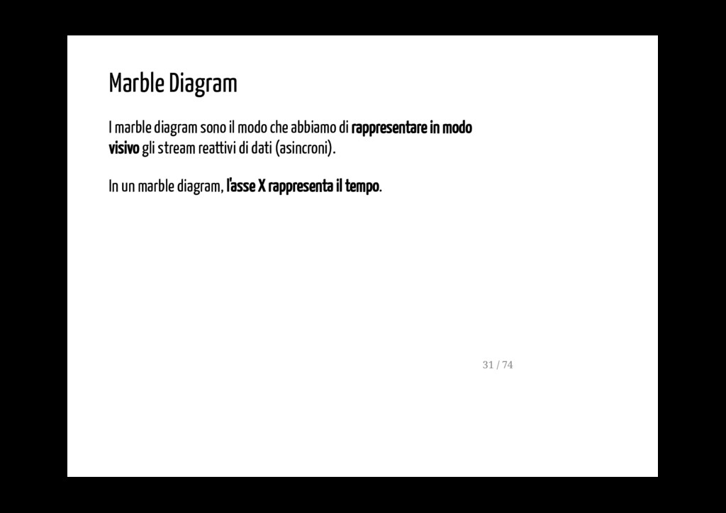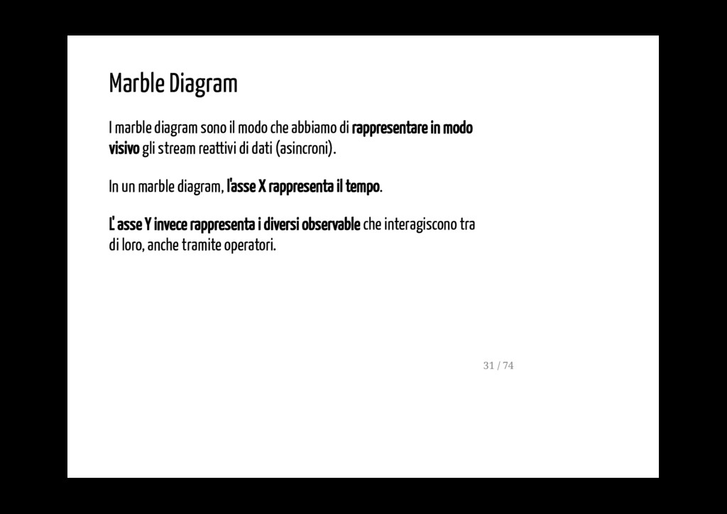 di rappresentare in modo visivo gli stream reattivi di dati (asincroni). In un marble diagram, l'asse X rappresenta il tempo. L' asse Y invece rappresenta i diversi observable che interagiscono tra di loro, anche tramite operatori. 31 / 74