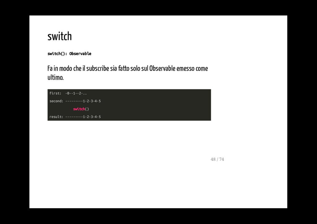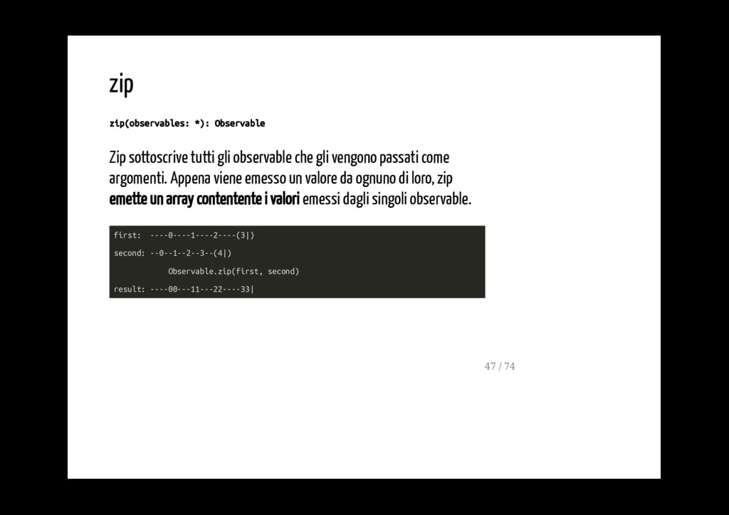 gli vengono passati come argomenti. Appena viene emesso un valore da ognuno di loro, zip emette un array contentente i valori emessi dagli singoli observable. first: ----0----1----2----(3|) second: --0--1--2--3--(4|) Observable.zip(first, second) result: ----00---11---22----33| 47 / 74