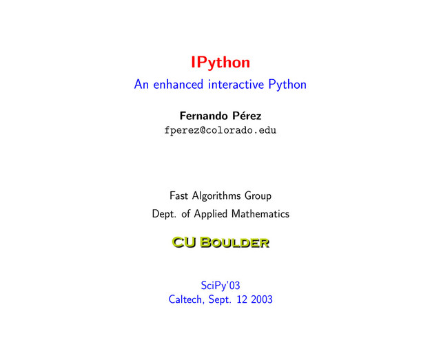 one of Python’s greatest strengths. But: it feels like a half-implemented idea (vs. the Unix shell, or Mathematica’s prompt) A 2-minute history of IPython • I found Python in 2001 as a Perl/sh/awk/sed/C/C++/IDL/Mathematica refugee. • David Beazley’s slides: sys.displayhook → a Mathematica-like prompt. • An article on O’Reilly’s site → Janko Hauser’s and Nathaniel Gray’s work. • Nathan’s: $PYTHONSTARTUP enhancements. • Janko’s: a full shell built on top of the code.InteractiveConsole module. • I put together my modifications and theirs, as an ‘afternoon hack’ (famous last words). Six weeks later (with little sleep or thesis progress), IPython 0.1 was out. • As of this year, SciPy hosts IPython (http://ipython.scipy.org), it has public mailing lists, bug tracking and public CVS access. Thanks! 3