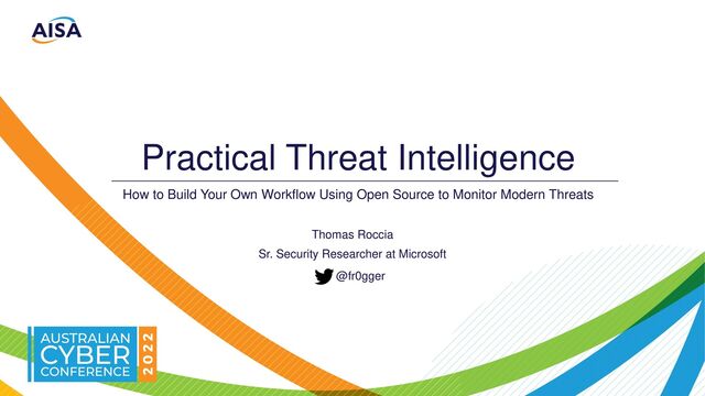 This presentation has been delivered during the CyberCon AISA in Melbourne. It talks about threat intelligence and open source technologies including OpenCTI, ELK and Jupyter.
