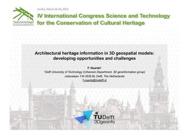 challenges Seville, March 27, 2019 F. Noardo [email protected] • LoDs specifications for heritage; • few data for permitting complex operations; • technical issues (software and data formats); • Hardware issues (high performances are required)… Heritage in 3D city models: challenges