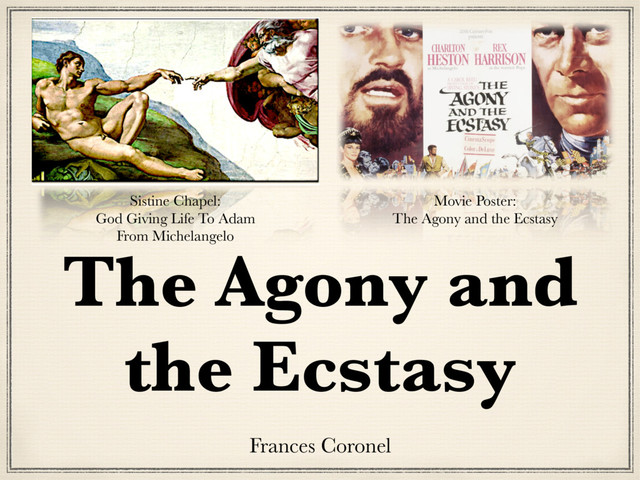 New York City, New York, U.S.A.: New American Library, 1964. Print. "IMDb user reviews for The Agony and the Ecstasy." IMDb. The Internet Movie Database, 1999-2011. Web. 16 May 2011. <http:// www.imdb.com/title/tt0058886/usercomments?filter=best>. Neret, Gilles. Michelangelo. Special ed Edition. Los Angeles, CA: TASCHEN, 2010. Print. Stone, Irving. The Agony and the Ecstasy . 1st ed. New York, New York, U.S.A: Doubleday, 1961. Print. "The Agony and the Ecstasy." Wahello. Wahello.com, 2000-2009. Web. 16 May 2011. <http://www.walhello.com/ the+agony+and+the+ecstasy.html>. Rich, David. "2008 AP EXAM REVIEW GUIDE." AP European History. Westerchester Country Day School, 2007-2008. Web. 16 May 2011. <http://faculty.westchestercds.us/davidrich/ files/ ap%20europe/2008%20REVIEW%20GUIDE.pdf>. Rojas, Ms. Laurie. "The Renaissance – Michelangelo [1475 - 1564]." At European History. University of Chicago, 12 October 2007. Web. 16 May 2011. <http://blogs.ucls.uchicago.edu/apeh/2007/10/12/the-renaissance-michelangelo-1475-1564/>.