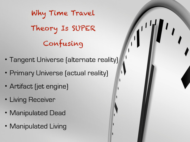 in time & jet engine from future crashes through Donnie’s bedroom; will only last 28 days before it collapses and destroys itself & primary universe • Primary Universe-PU (actual reality): will be destroyed if Artifact is not returned • Artifact (jet engine): only way to prevent world destruction is to guide this back into primary universe through time portal because it has reason to exist & will close TU & restore PU • Living Receiver- Donnie: must guide jet engine back to primary universe with supernatural powers (increased strength & ability to conjure fire, water, & telekineses) • Manipulated Dead: anyone connected to Donnie who dies in TU; like Frank & have to help Donnie with his quest to return jet engine • Manipulated Living: anyone connected to Donnie who subconsciously aid Donnie to save Universe, which is why Gretchen is there to motivate Donnie to sacrifice himself to save Universe Why Time Travel Theory Is REALLY Confusing