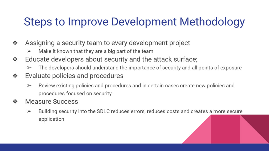 to every development project ➢ Make it known that they are a big part of the team ❖ Educate developers about security and the attack surface; ➢ The developers should understand the importance of security and all points of exposure ❖ Evaluate policies and procedures ➢ Review existing policies and procedures and in certain cases create new policies and procedures focused on security ❖ Measure Success ➢ Building security into the SDLC reduces errors, reduces costs and creates a more secure application