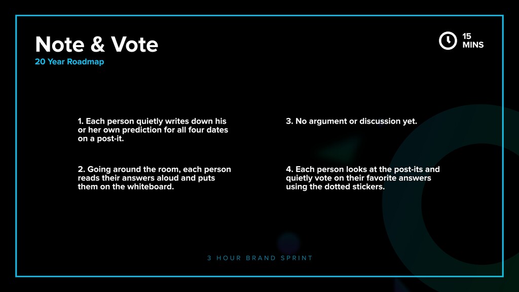 s p r i n t 20 Y ear Roadmap Note & Vote 15 MINS 4. Each person looks at the post-its and quietly vote on their favorite answers using the dotted stickers. 3. No argument or discussion yet. 2. Going around the room, each person reads their answers aloud and puts them on the whiteboard. 1. Each person quietly writes down his or her own prediction for all four dates on a post-it.