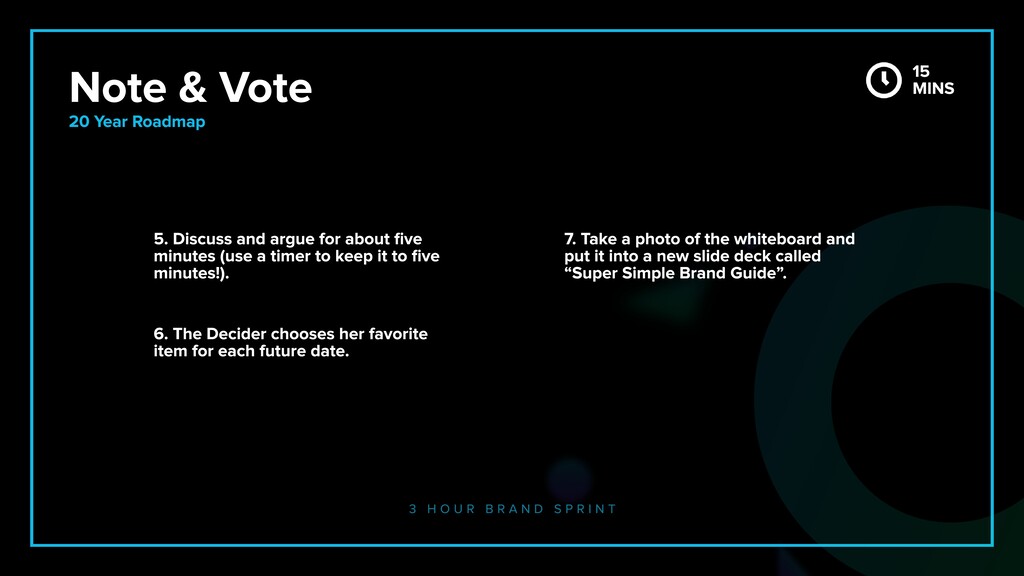 s p r i n t 20 Y ear Roadmap Note & Vote 15 MINS 7. Take a photo of the whiteboard and put it into a new slide deck called “Super Simple Brand Guide”. 6. The Decider chooses her favorite item for each future date. 5. Discuss and argue for about five minutes (use a timer to keep it to five minutes!).