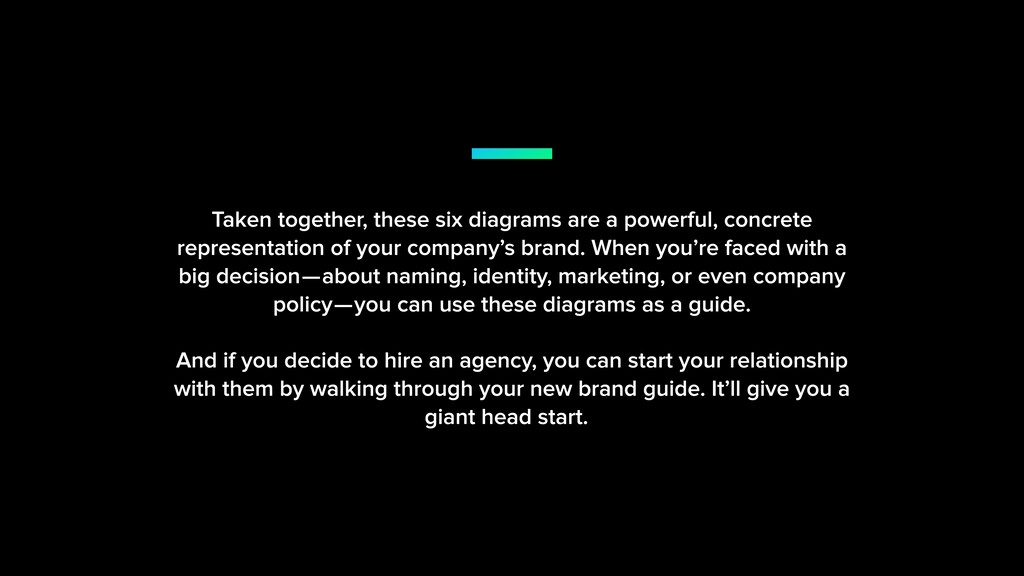 of your company’s brand. When you’re faced with a big decision — about naming, identity, marketing, or even company policy — you can use these diagrams as a guide. And if you decide to hire an agency, you can start your relationship with them by walking through your new brand guide. It’ll give you a giant head start.
