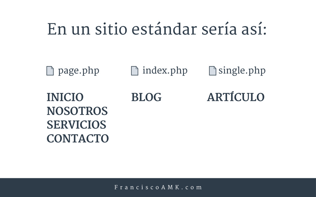M K . c o m En un sitio estándar sería así: index.php BLOG single.php ARTÍCULO page.php INICIO NOSOTROS SERVICIOS CONTACTO