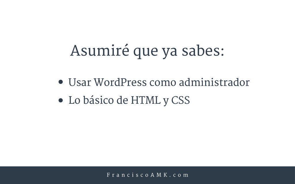 M K . c o m Asumiré que ya sabes: Usar WordPress como administrador Lo básico de HTML y CSS