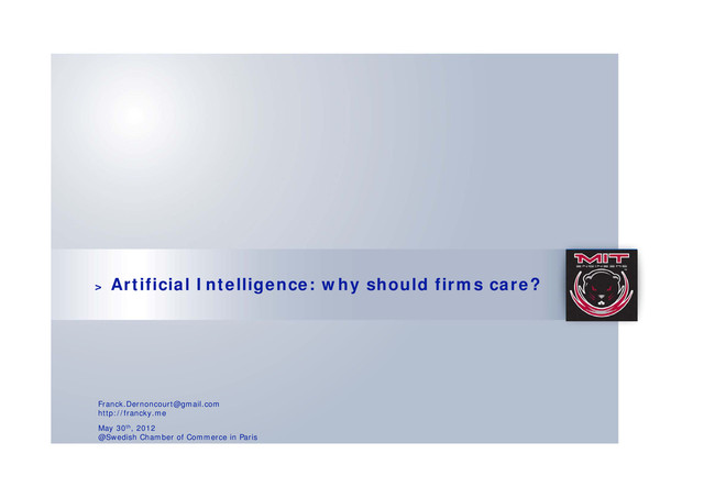As I was reading an article about IBM Watson, a small sentence drew my attention: "Eighty or 90 per cent of these requests don't need Watson anyway, technology already exists for what they need.". This epitomizes the growing need for the business world to catch up with artificial intelligence's latest developments. What is AI? What is the state of the art? Why should I care? i.e. what can AI bring to the business world? From law to finance, any field will be reshaped in the long term by AI.