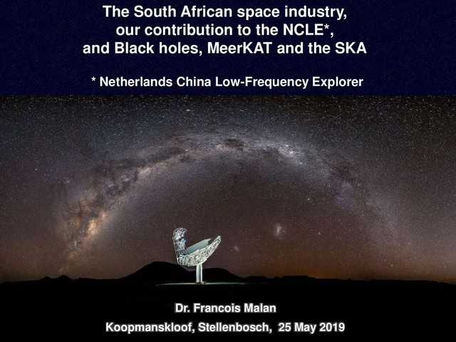 A brief overview of the South African satellite-building industry, some of our achievements, and with special focus on our contribution to the Netherlands-China Low-Frequency Explorer (NCLE) project.