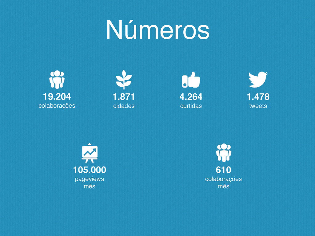 Números 19.204 colaborações 1.871 cidades 4.264 curtidas 1.478 tweets 105.000