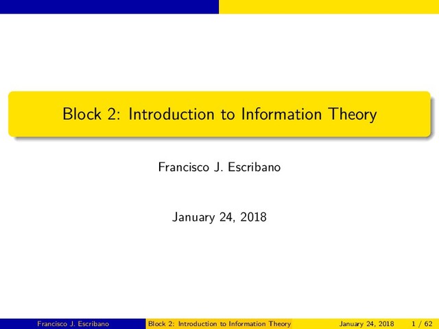 2nd half of the XXth Century. It relies on solid mathematical foundations [1, 2, 3, 4]. It tries to address two basic questions: ◮ To what extent can we compress data for a more efficient usage of the limited communication resources? → Entropy ◮ Which is the largest possible data transfer rate for given resources and conditions? → Channel capacity Key concepts for Information Theory are thus entropy (H (X)) and mutual information (I (X; Y)). ◮ X, Y are random variables (RRVV) of some kind. ◮ Information will naturally be characterized by means of RRVV. Francisco J. Escribano Block 2: Introduction to Information Theory January 24, 2018 4 / 62