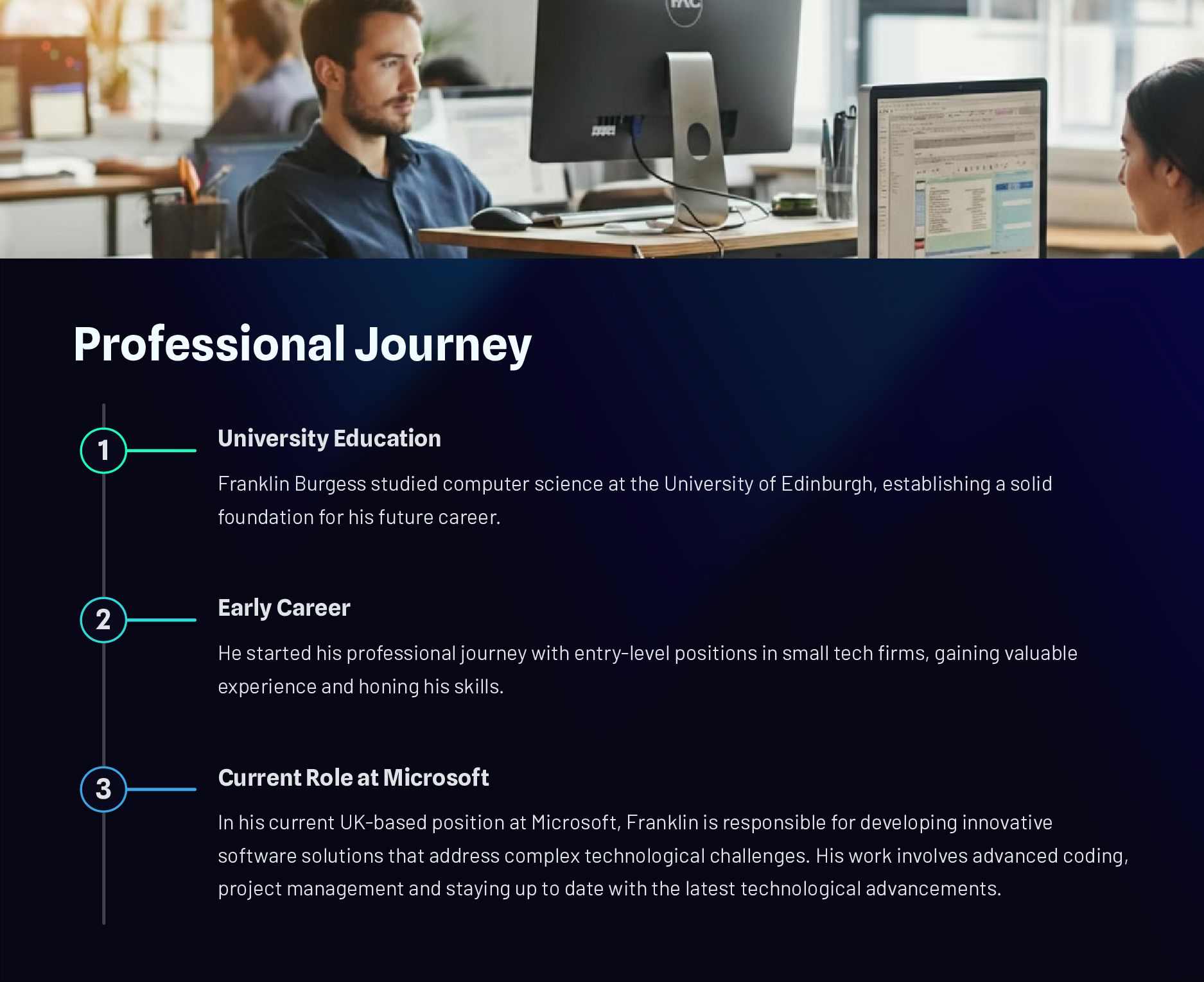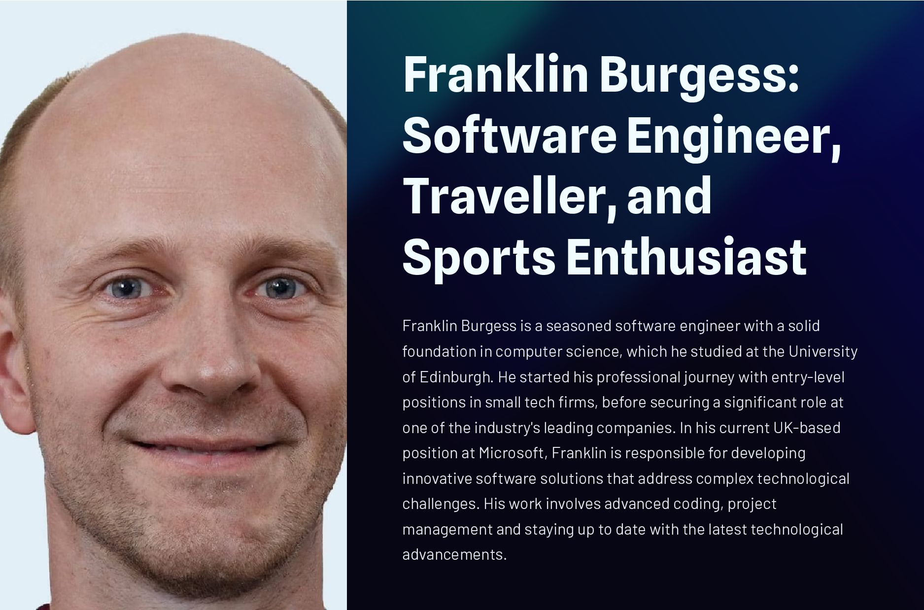 Franklin Burgess is a seasoned software engineer with a solid foundation in computer science, which he studied at the University of Edinburgh. He started his professional journey with entry-level positions in small tech firms, before securing a significant role at one of the industry's leading companies.
