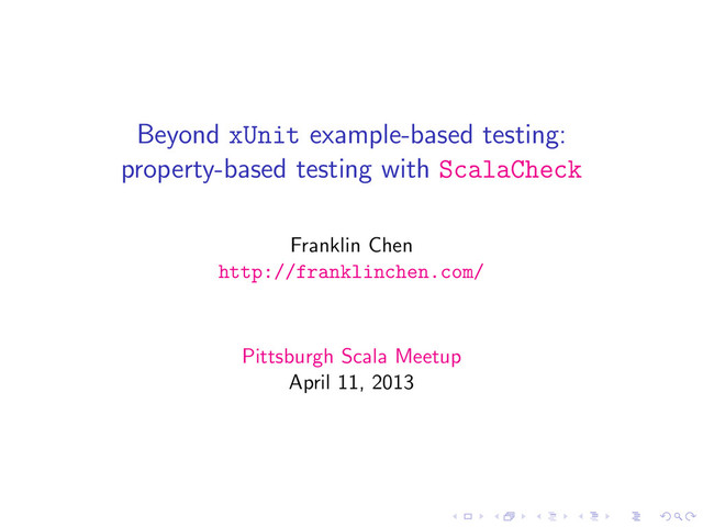 I will discuss the concepts of property-based testing and illustrate them concretely using ScalaCheck for Scala, and point toward similar test frameworks in other languages.