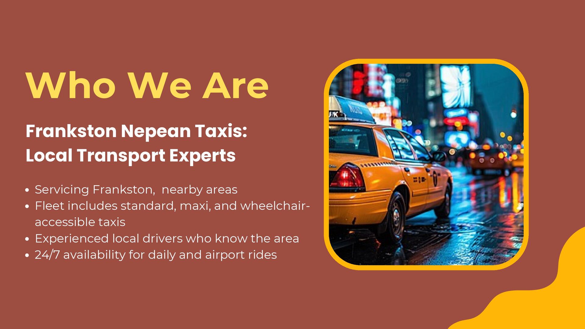 accessible taxis Experienced local drivers who know the area 24/7 availability for daily and airport rides Who We Are Frankston Nepean Taxis: Local Transport Experts