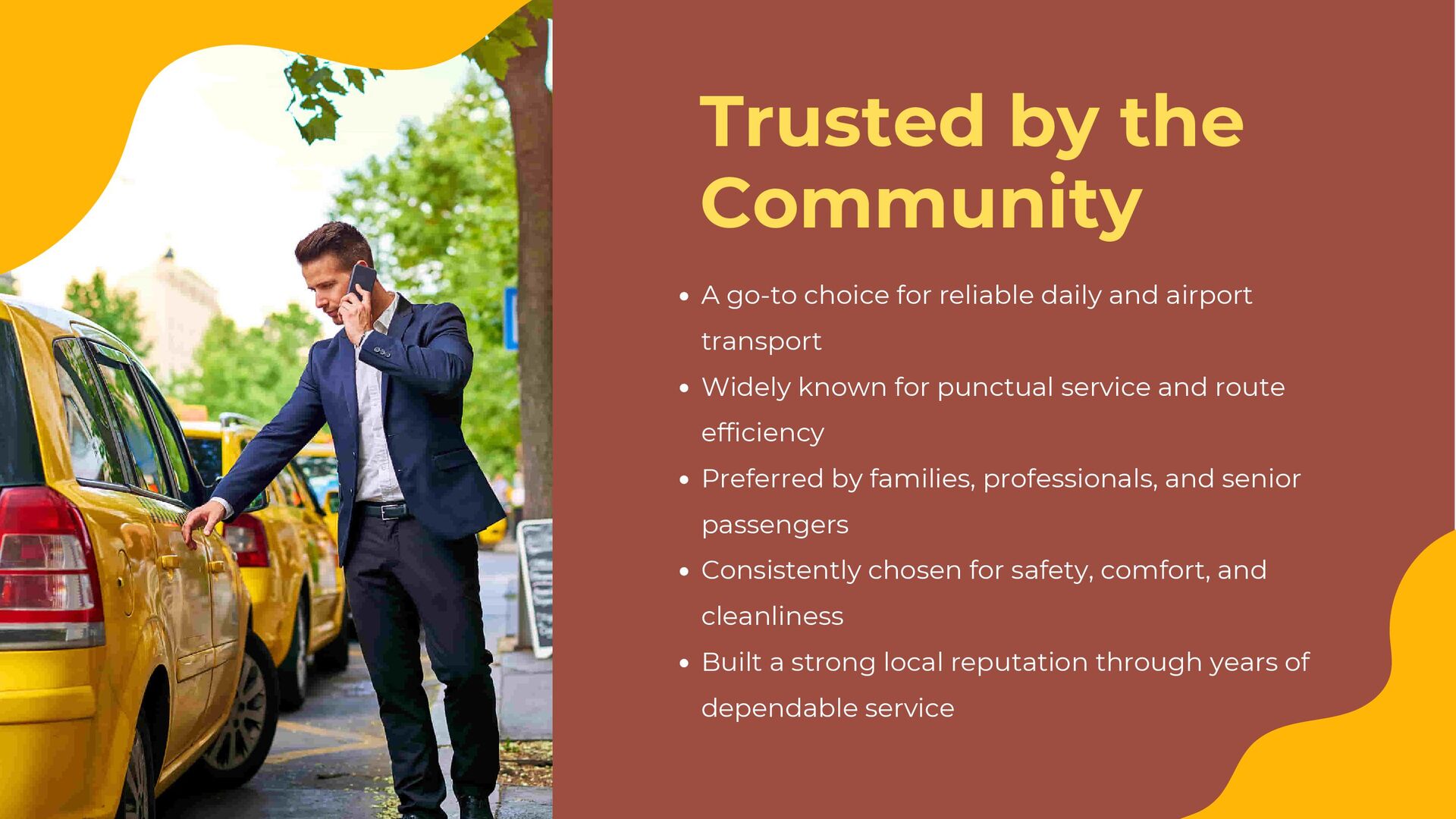 and airport transport Widely known for punctual service and route efficiency Preferred by families, professionals, and senior passengers Consistently chosen for safety, comfort, and cleanliness Built a strong local reputation through years of dependable service