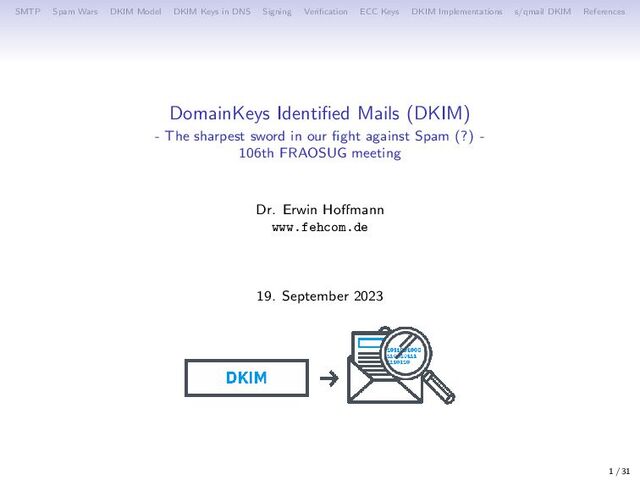 Verification ECC Keys DKIM Implementations s/qmail DKIM References DKIM signed Message Sample DKIM-Signature: v=1; a=rsa-sha256; c=relaxed/relaxed; d=fehcom.de; s=default; x=1695295824; q=dns/txt; h=Received: Mailing-List:Precedence:list-help:list-unsubscribe:list-post: Delivered-To:Received:Received-SPF:Date:From:To:Subject: Message-ID:MIME-Version:Content-Type:Content-Disposition; bh=JO BJBgOCD2P2qaKx2RrUz59d3+yJ/BsP8IBHAGYPORc=; b=eAAJdvIsx3dkct1FXE vmiDHZDpTySpfmrdPeKDKSWSY89QQKuBOc17KaOETvBFdk9U6favUR2JHazPPrbP wTQZwnFeB74iVmJsZQj/uihC2k5MDZ4VWhub/uNNKzJjxtTxzmwdhGdgu6LFXgg4 9S58UwUw76JhpoA0IDG0hRzJA= Received: (qmail 3928722 invoked by alias); 14 Sep 2023 11:30:12 -0000 Mailing-List: contact