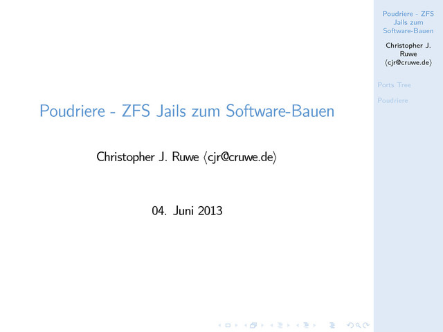 Ports Tree Poudriere . . . .. . . . .. . . . .. . . . . .. . . . .. . . . .. . . . .. . . . . .. . . . .. . . . .. . . . .. . . . . .. . . . .. . . . .. . . . .. . . . . .. . . . .. . . . . .. . . . .. . . . .. . Poudriere - ZFS Jails zum Software-Bauen Christopher J. Ruwe ⟨