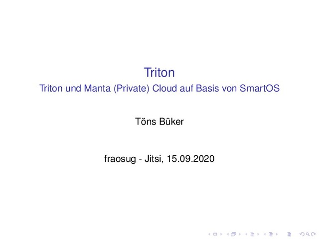 Vortrag von Töns Büker: Triton und Manta sind Produkte von Joyent und gleichzeitig OpenSource Projekte, mit denen man sich eine (private) Cloud auf Basis von SmartOS bauen kann. Heute gibt es einen kurzen Überblick über Triton und Manta sowie neue Funktionen und Entwicklungen in beiden Projekten.
