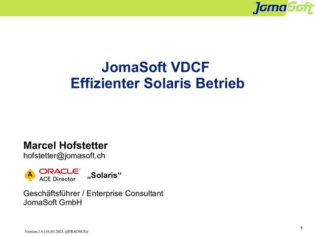Jahren CEO bei der JomaSoft GmbH seit 21 Jahren Internationaler Speaker: Oracle OpenWorld, DOAG, UKOUG, SOUG, AOUG „Solaris“ https://twitter.com/marcel_jomasoft SOUG (Swiss Oracle User Group) – Speaker of the Year 2016 Hobby: Familie, Reisen, Wine & Dine, Kino https://www.jomasoftmarcel.blogspot.ch https://www.linkedin.com/in/marcelhofstetter