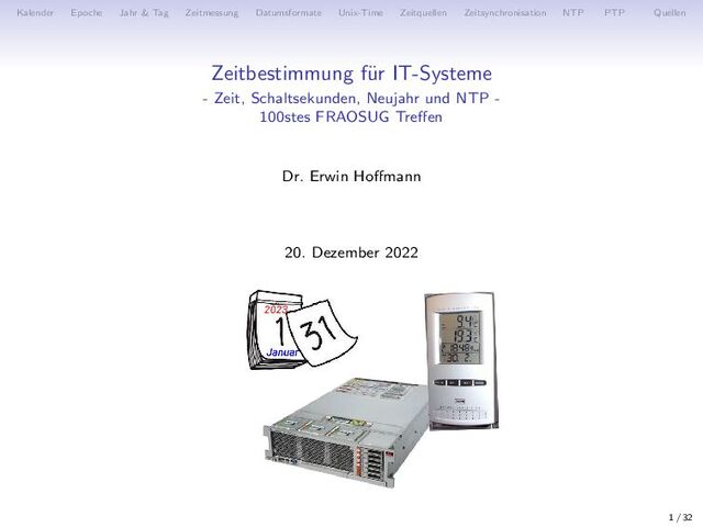 NTP PTP Quellen NTP-Zeittafel Date MJD NTP NTP Timestamp Epoch Erea Erea Offset 1 Jan -4712 -2,400,001 -49 1,795,583,104 1st day Julian 1 Jan -1 -679,306 -14 139,775,744 2 BCE 1 Jan 0 -678,491 -14 171,311,744 1 BCE 1 Jan 1 -678,575 -14 202,939,144 1 CE 4 Oct 1582 -100,851 -3 2,873,647,488 Last day Julian 15 Oct 1582 -100,840 -3 2,874,597,888 First day Gregorian 31 Dec 1899 15019 -1 4,294,880,896 Last day NTP Era -1 1 Jan 1900 15020 0 0 First day NTP Era 0 1 Jan 1970 40,587 0 2,208,988,800 First day UNIX 1 Jan 1972 41,317 0 2,272,060,800 First day UTC 31 Dec 1999 51,543 0 3,155,587,200 Last day 20th Century 8 Feb 2036 64,731 1 63,104 First day NTP Era 1 Tabelle: Die NTP-Zeittafel entsprechend RFC 5096; MJD: Modifed Julian Date ↪ Mit Einf¨ uhrung von UTC fing das ¨ Ubel bei Unix an. 23 / 32