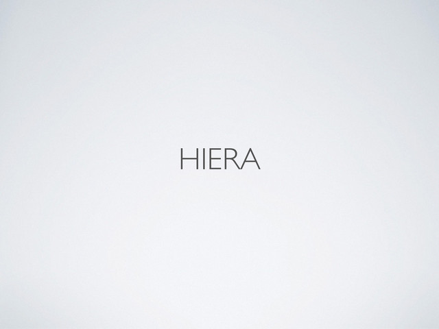 - test! gateway: 192.168.0.12! --- common.yaml! config:! sudoers: ! - ops! Similarly hiera_hash will parse all the files that match and merge the multiple hashes into a single one.