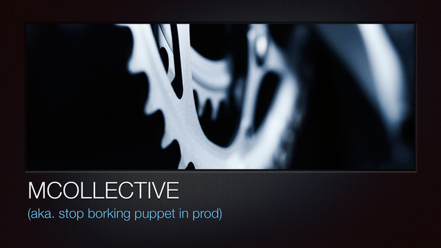 pool (ActiveMQ, Redis or RabbitMQ) Client, let you interact with the nodes using “mco” Server, running on each configured node Plugins that extend functionality (data gathered, actions possible, etc)