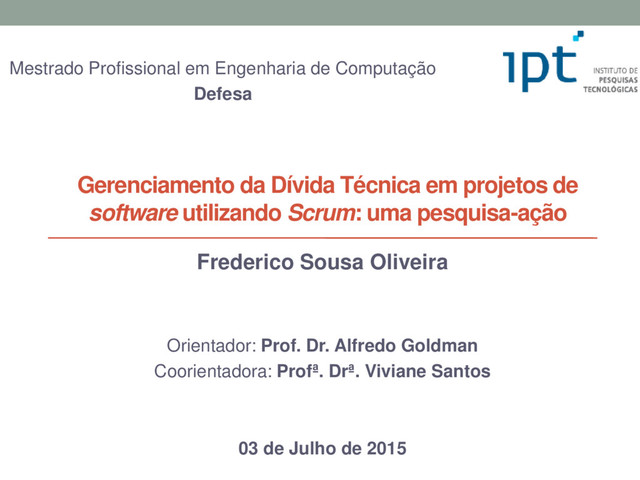 uma pesquisa-ação Frederico Sousa Oliveira Orientador: Prof. Dr. Alfredo Goldman Coorientadora: Profª. Drª. Viviane Santos 03 de Julho de 2015 Mestrado Profissional em Engenharia de Computação Defesa