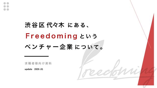 渋渋渋渋 学歴、バックグラウンド、考え方などは関係なく Freedomingで働く上では誰しも平等な権利があり誰しもが尊重される企業。 また、誰しもが社会、会社、周りの人々を変えることが出来る環境の創出。