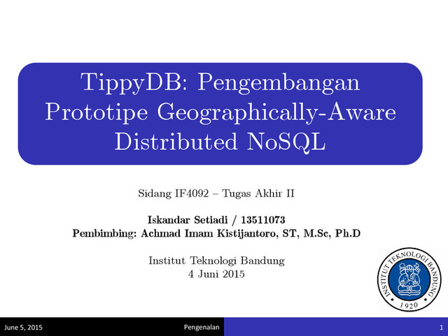 akhir ini bertujuan untuk meminimalkan jarak data yang disimpan dalam server dengan pengguna. Prototipe ini menggunakan asumsi probabilistik bahwa pengguna yang mengakses (read) data adalah pengguna yang terletak dekat dengan pengguna yang menulis data pertama kali. Prototipe: TippyDB June 5, 2015 7