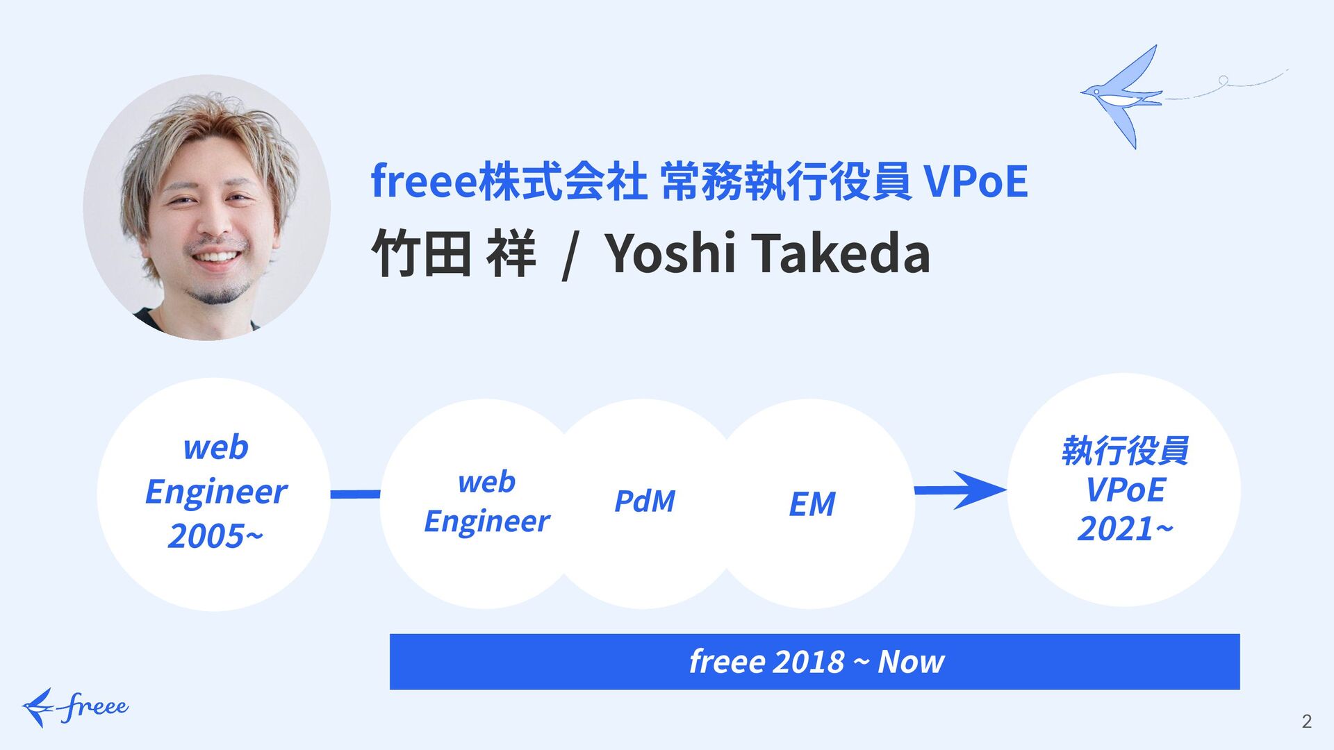 VPoE 2021~ freee株式会社 常務執⾏役員 VPoE EM freee 2018 ~ Now PdM web Engineer