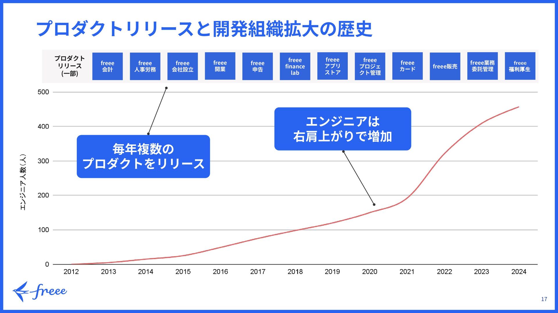 会社設⽴ freee 開業 freee 申告 freee finance lab freee アプリ ストア freee プロジェ クト管理 freee カード freee販売 freee業務 委託管理 freee 福利厚生 エンジニアは 右肩上がりで増加 毎年複数の プロダクトをリリース