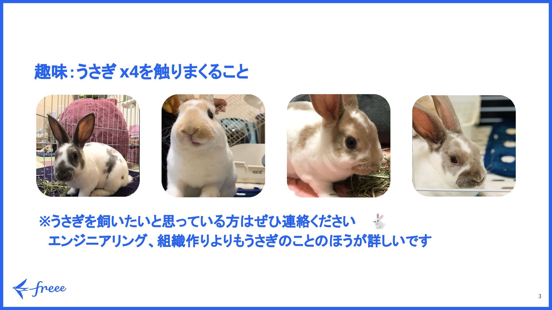 3 趣味:うさぎ x4を触りまくること ※うさぎを飼いたいと思っている方はぜひ連絡ください 🐇 エンジニアリング、組織作りよりもうさぎのことのほうが詳しいです