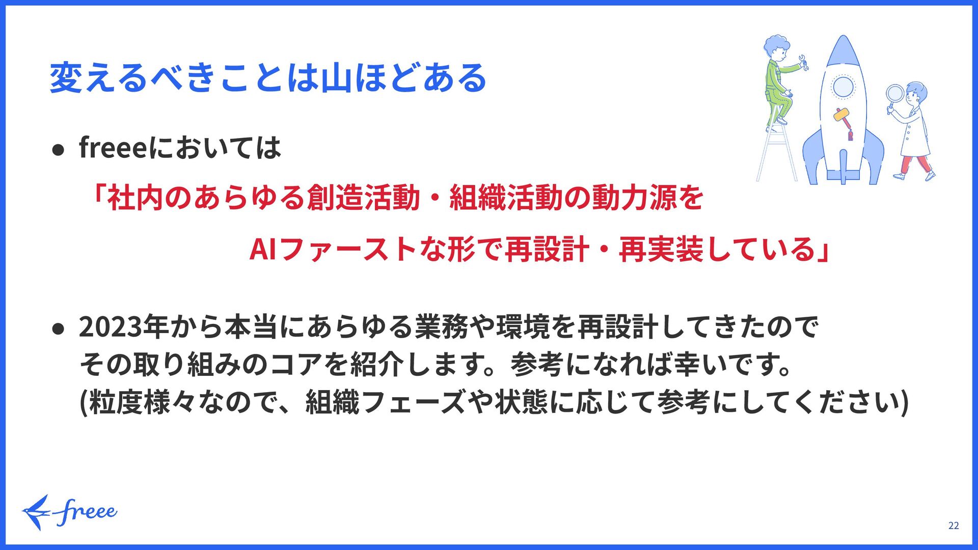 22 変えるべきことは⼭ほどある • freeeにおいては 「社内のあらゆる創造活動‧組織活動の動⼒源を AIファーストな形で再設計‧再実装している」 • 2023年から本当にあらゆる業務や環境を再設計してきたので その取り組みのコアを紹介します。参考になれば幸いです。 (粒度様々なので、組織フェーズや状態に応じて参考にしてください)